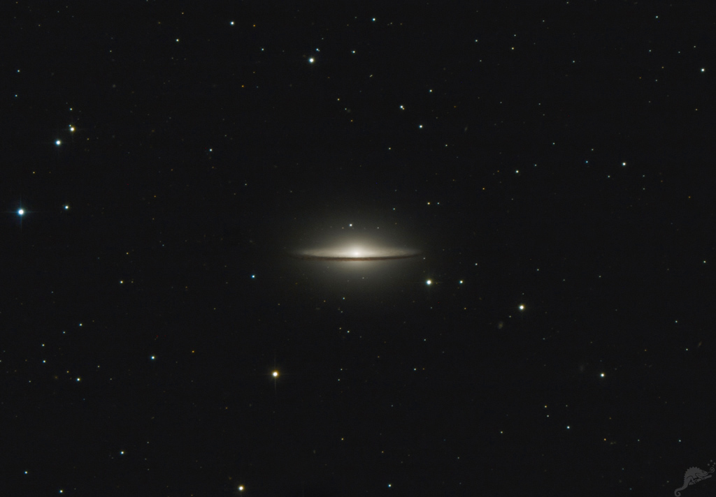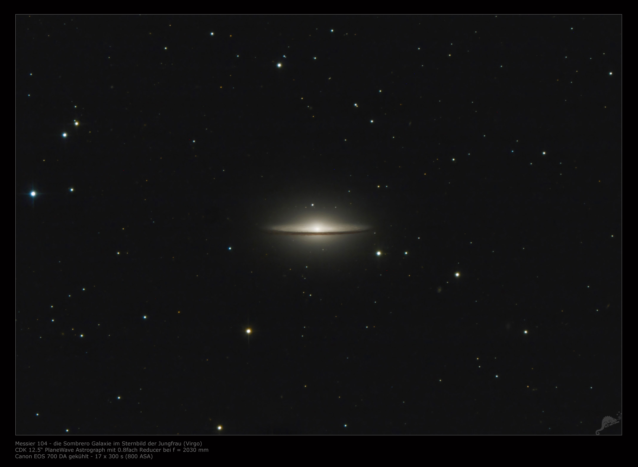 | Objektbeschreibung: Unser Bild zeigt die Galaxie Messier 104 (NGC 4594) an der Grenze zwischen den Sternbildern der Jungfrau (Virgo) und dem Raben (Corvus), die auch den Beinamen Sombrero Nebel oder Sombrero Galaxie trägt. Auffällig ist der extrem große Kernbereich (Bulge) mit einem riesigen Halo sowie dem markante Staubband, welches an einen riesigen, mexikanischen Sombrero erinnert. Nach der Hubble Klassifikation ist sie als normale Spiralgalaxie des Typs Sa oder Sb katalogisiert. Wir schauen von der Erde aus gesehen unter einem Winkel von nur 7 Grad direkt auf die Ebene (das Staubband) der Galaxie. Aufgrund der Sichtlinie sind deswegen die Spiralarme auf unserem Bild praktisch nicht sichtbar. Sie liegt in Richtung des großen Virgo Galaxienhaufens, steht aber mit einer Entfernung von etwa 30 Millionen Lichtjahren zwischen unserer Milchstraße und dem Virgohaufen. Mit einem wahren Durchmesser von 50.000 Lichtjahren ist sie etwa nur halb so groß wie unsere Milchstraße, sie beinhaltet geschätzt etwa 800 Milliarden Sonnenmassen. |