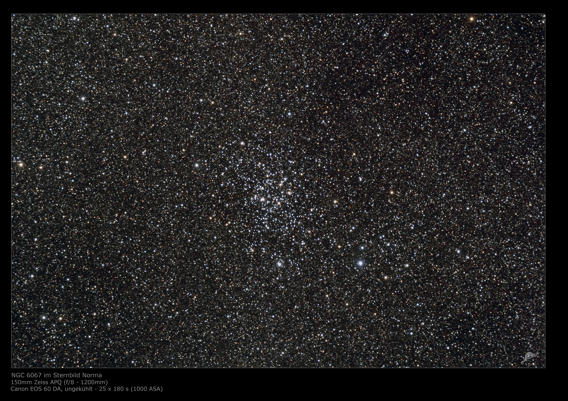 | Objektbeschreibung: NGC 6067 ist auch - visuell betrachtet - ein wunderschöner, konzentrierter offener Sternhaufen und ein Highlight im Sternbild Norma (Winkelmaß). Er beinhaltet etwa 100 Sterne der 10. Größenklasse und schwächer. Nach Shapley wird er als Typ der Klasse I 2 r klassifiziert. Der Sternhaufen hat spektralen Untersuchungen zufolge ein Alter von etwa 90 Millionen Jahren. Innerhalb des Haufens befindet sich der massereiche Planetarische Nebel PK 329.5-02.2, der aber auf Grund seines geringen Durchmessers in unserem Bildmaßstab nicht sichtbar ist. Die Entfernung zum Sonnensystem beträgt geschätzt etwa 4.600 Lichtjahre. Entdeckt wurde NGC 6067 von James Dunlop, einem schottischen Astronomen, der von Australien aus beobachtete, am 8. Mai 1826 . |