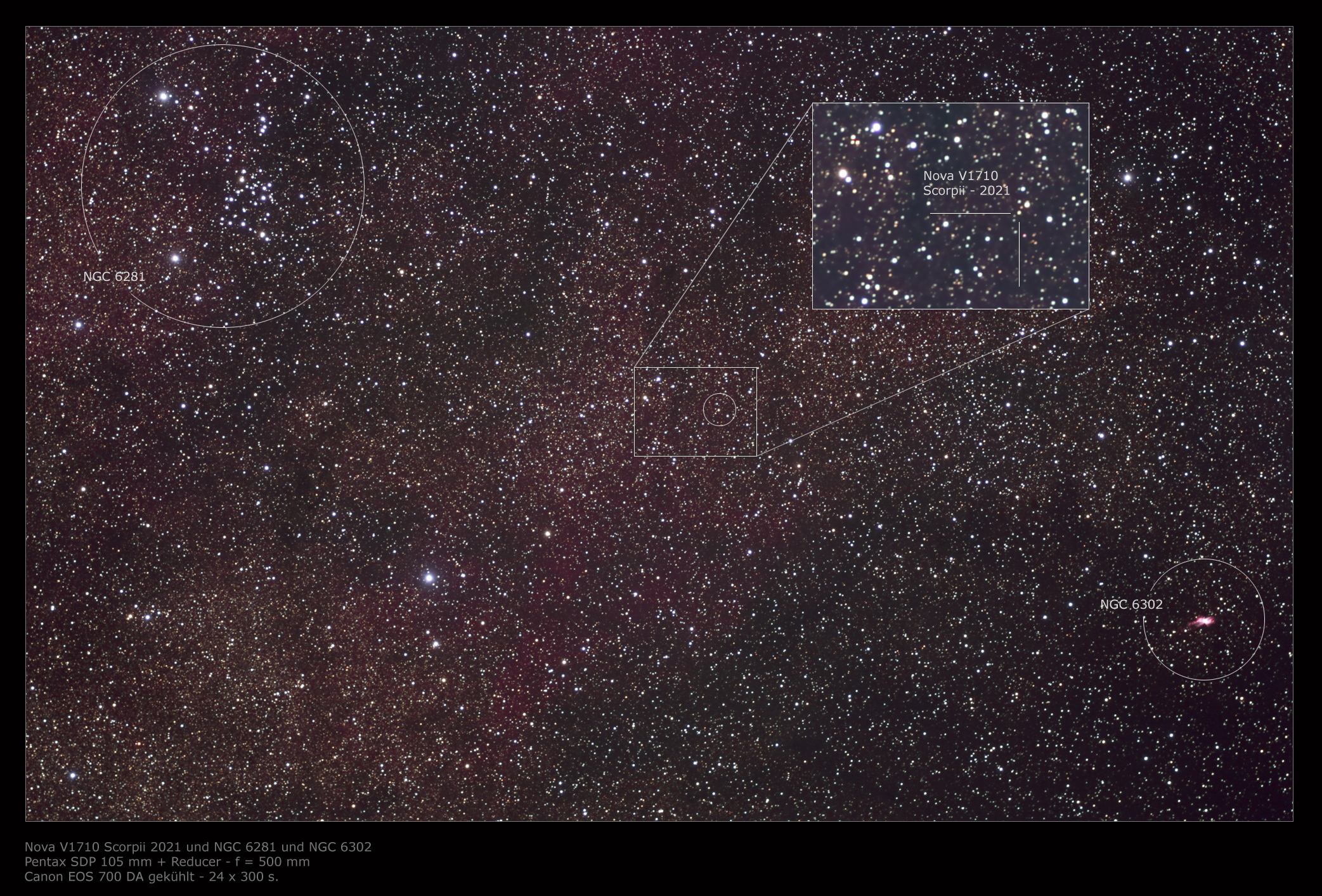 | Objektbeschreibung: Die Nova wurde nahezu zeitgleich vom australischen Amateurastronomen Paul Camilleri und dem All-Sky Automated Survey for Supernovae (ASAS-SN) am 12. April 2021 entdeckt. Die Helligkeit lag zum Zeitpunkt der Entdeckung bei der 9.5 Größenklasse und wurde in den nächsten Tagen etwas heller (8.5 Größenklasse) und danach schnell wieder lichtschwächer. Spektren deuten darauf hin, dass es sich bei V1710 Scorpii um eine klassische Nova handelt, das heißt, dass es sich um einen ersten aufgezeichneten Ausbruch handelt und dass die Nova zur Fe-II-Klasse gehört, in deren Spektrum auffällige Emissionslinien von ionisiertem Eisen zu finden sind. Eine Nova entsteht, wenn ein Weißer Zwergstern Wasserstoffgas aufgrund seiner starken Gravitation von einem eng um ihn kreisenden Begleitstern abzieht. Das Material strömt spiralförmig zur Oberfläche des weißen Zwergs ab und sammelt sich dort an. Wenn diese Schicht eine Dicke von etwa 200 Metern erreicht, verdichtet und erhitzt die starke Schwerkraft des Sterns den Wasserstoff, bis er in einer thermonuklearen Kettenreaktion explosionsartig verschmilzt. Bei einer Nova kann ein ansonsten lichtschwaches Sternsystem über Nacht um bis zu 15 Größenklassen aufleuchten. Nova Explosionen sind zwar katastrophal, lassen aber das Doppelsternsystem intakt, so dass der Weiße Zwerg nach dem Abklingen des Ausbruchs wieder seine weitere Entwicklung fortsetzen kann. Wiederholt sich im Laufe von vielen Jahren oder Jahrhunderten - wie zum Beispiel beim System RS Ophiuchus - solch ein Ausbruch, so spricht man von einer wiederkehrenden Nova. Die Position der Nova lag in einer interessanten Region im Skorpion zwischen dem Bugnebel (NGC 6302) und dem offenen Sternhaufen NGC 6281, eingebettet in H-II Emissionsnebeln. Deshalb haben wir im Juli 2021 eine Aufnahme der Himmelsregion aufgenommen. Interessanterweise ist das Sternsystem noch sichtbar, wenn auch die Helligkeit nun deutlich der 15. Größenklasse liegt. |