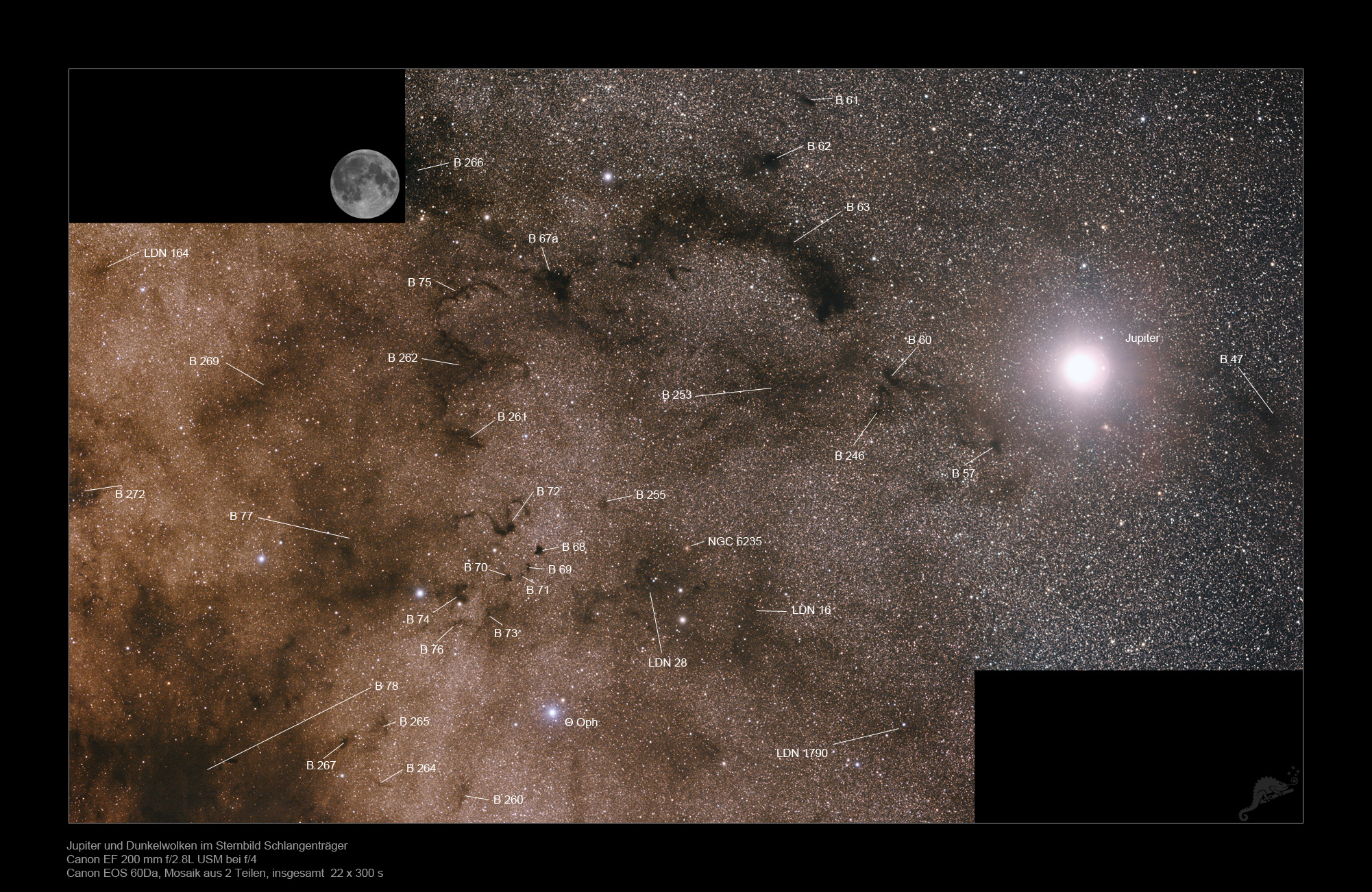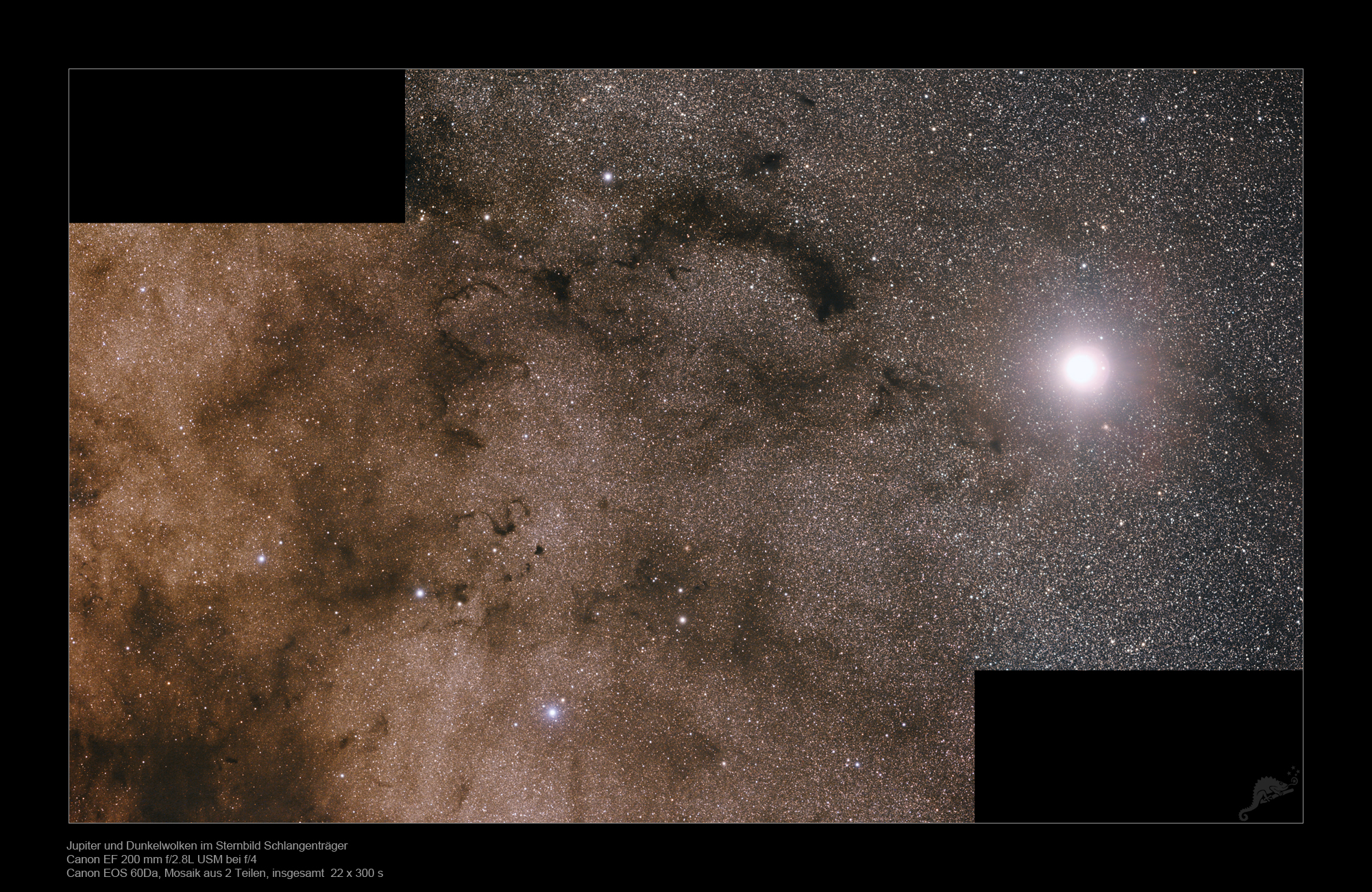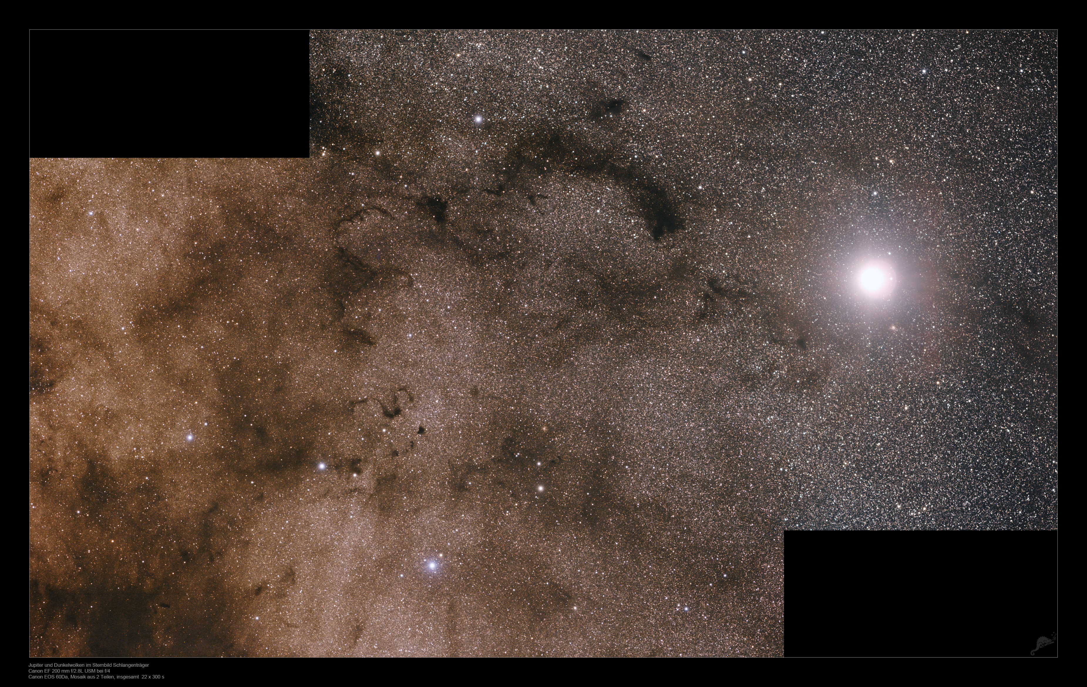 | Objektbeschreibung: Unser Bild zeigt ein 2-teiliges Mosaik von einigen großen Dunkelwolken im Sternbild Ophiuchus zusammen mit dem Planeten Jupiter. Bildorientierung: Norden oben und Osten links. Etwas links der Bildmitte liegt Barnard 72, der Schlangennebel. Im Schlangenträger liegen zahlreiche, große Dunkelwolken, die zunächst fotografisch vom amerikanischen Astronomen Edward Emerson Barnard katalogisiert wurden. Den kompletten Katalog von über 300 Dunkelwolken von Barnard findet man unter dieser URL. Barnard war Autodidakt und einer der Pioniere der Astrofotografie. In neuerer Zeit folgten ausführlichen Untersuchungen von K. Dobashi im infraroten Licht.