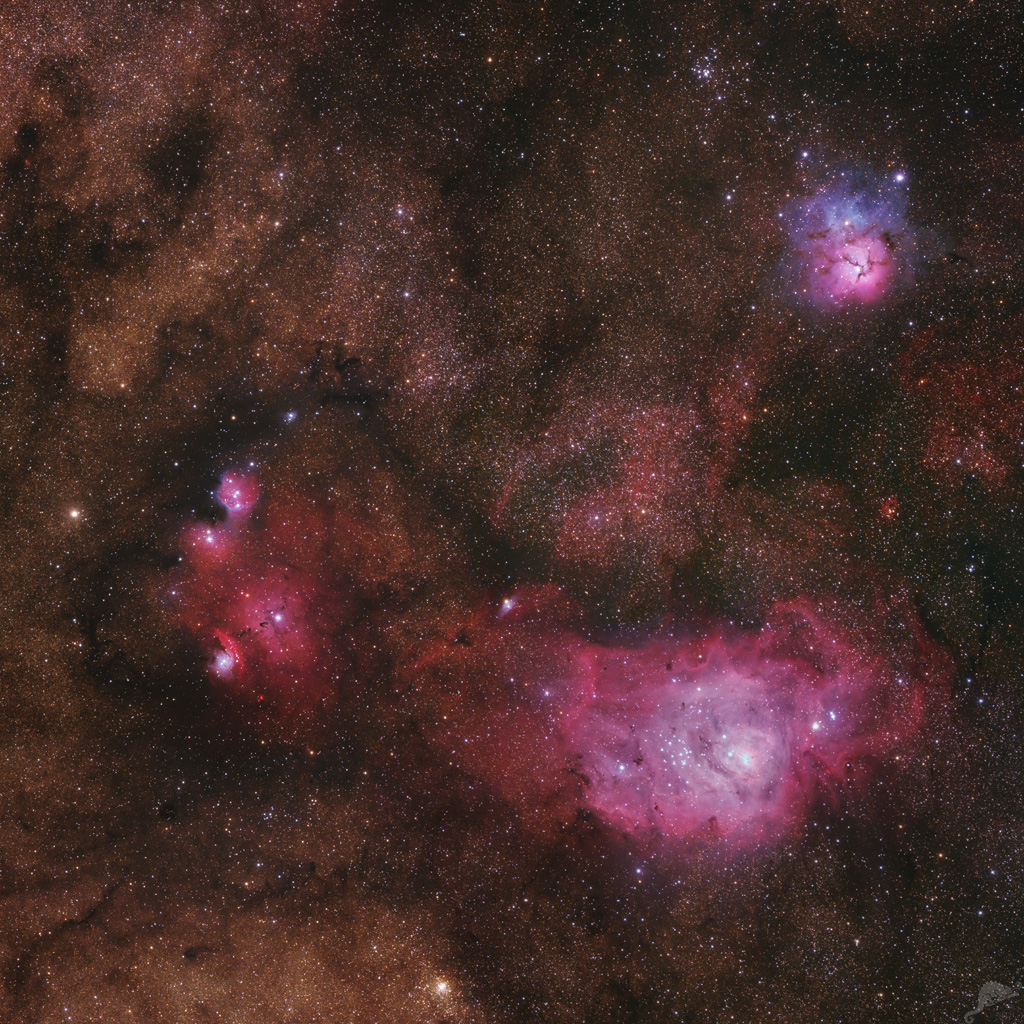 Mosaik aufgenommen mit einer Brennweite von f = 670 mm The region around M 8, M 20, M 21 and IC 1274/75 - a mosaic of 4 taken with a focal length of f = 670 mm |