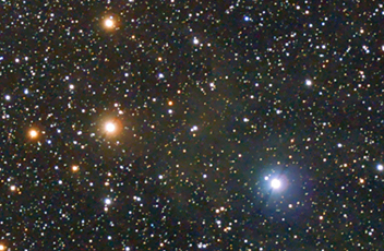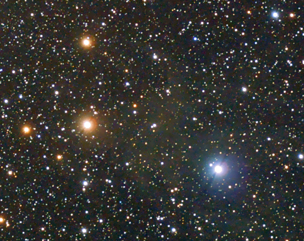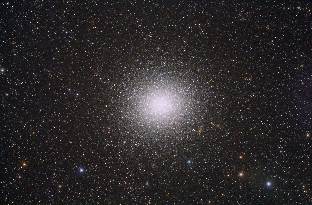 | Objektbeschreibung: Unser Bild zeigt ein HDR Komposit von NGC 5139 - Omega Centauri. Es ist der größte von etwa 200 Kugelsternhaufen unserer Galaxie und enthält auf einem Raumvolumen von etwa 150 Lichtjahren Durchmesser weit mehr als 1 Million Sterne. In seinem Zentrum ist die Sterndichte ca. 40mal höher als in der Umgebung der Sonne. Innerhalb der lokalen Gruppe von Galaxien wird er in seiner Größe nur von Mayall II, einem Kugelsternhaufen im Andromedanebel, übertroffen. Das Alter der Sterne beträgt mehr als 12 Milliarden Jahre Die Entfernung von der Erde beträgt etwa 18000 Lichtjahre. NGC 5139 wird dem Typ VIII zugeordnet. Entdeckt wurde NGC 5139 im Jahr 1677 von Edmond Halley Neuere Untersuchungen zeigen, dass Omega Centauri sehr wahrscheinlich der Kern einer ehemaligen Zwerggalaxie ist, deren äußere Sterne von der Milchstraße absorbiert wurden. Am Himmel kann man den Sternhaufen mit bloßem Auge als deutlich nebligen Fleck erkennen. Der hellste Bereich des Haufens bedeckt eine Fläche von der Größe des Mondes. PGC 47 340 (ESO 270-15) ist eine Balkenspirale mit einer scheinbaren Größe von ca. 2 x 1 Bogenminuten. Bei einer visuellen Helligkeit von 14.5 Größenklasse ist sie etwa 200 Millionen Lichtjahre vom Sonnensystem enfernt. Während der Bildbearbeitung fiel südwestlich von NGC 5139 zwischen den beiden helleren Sternen HD 116 337 und HD 116 197 eine kleine, bräunlich farbige Wolke auf. Zunächst für einen Reflex gehalten, ergab eine Datenrecherche bei Aladin/Simbad, dass es sich dabei um eine kleine Molekülwolke mit der Katalogbezeichnung PGCC G308.43+14.62 handelt. Sicher ein extrem selten fotografiertes Objekt ! |