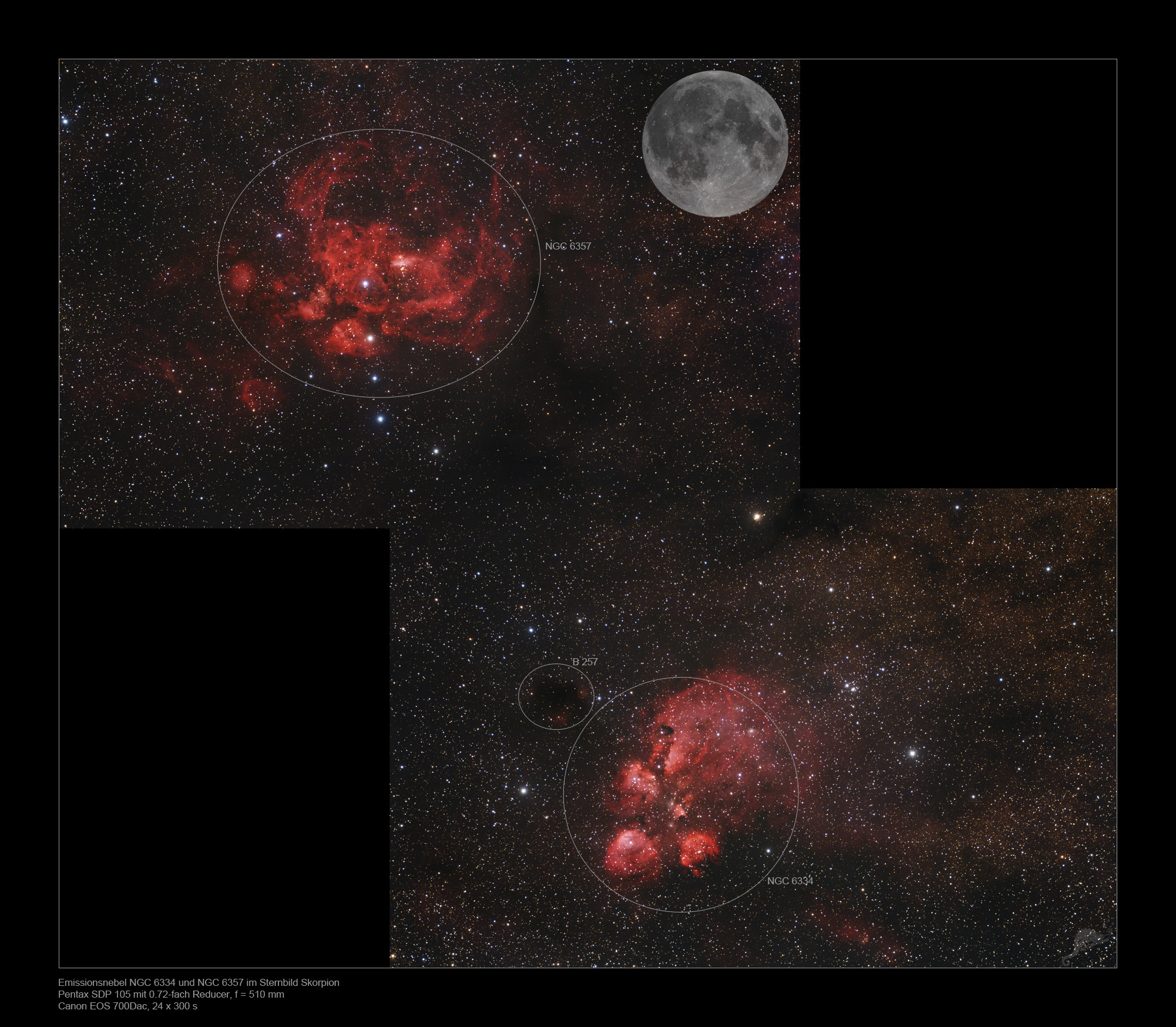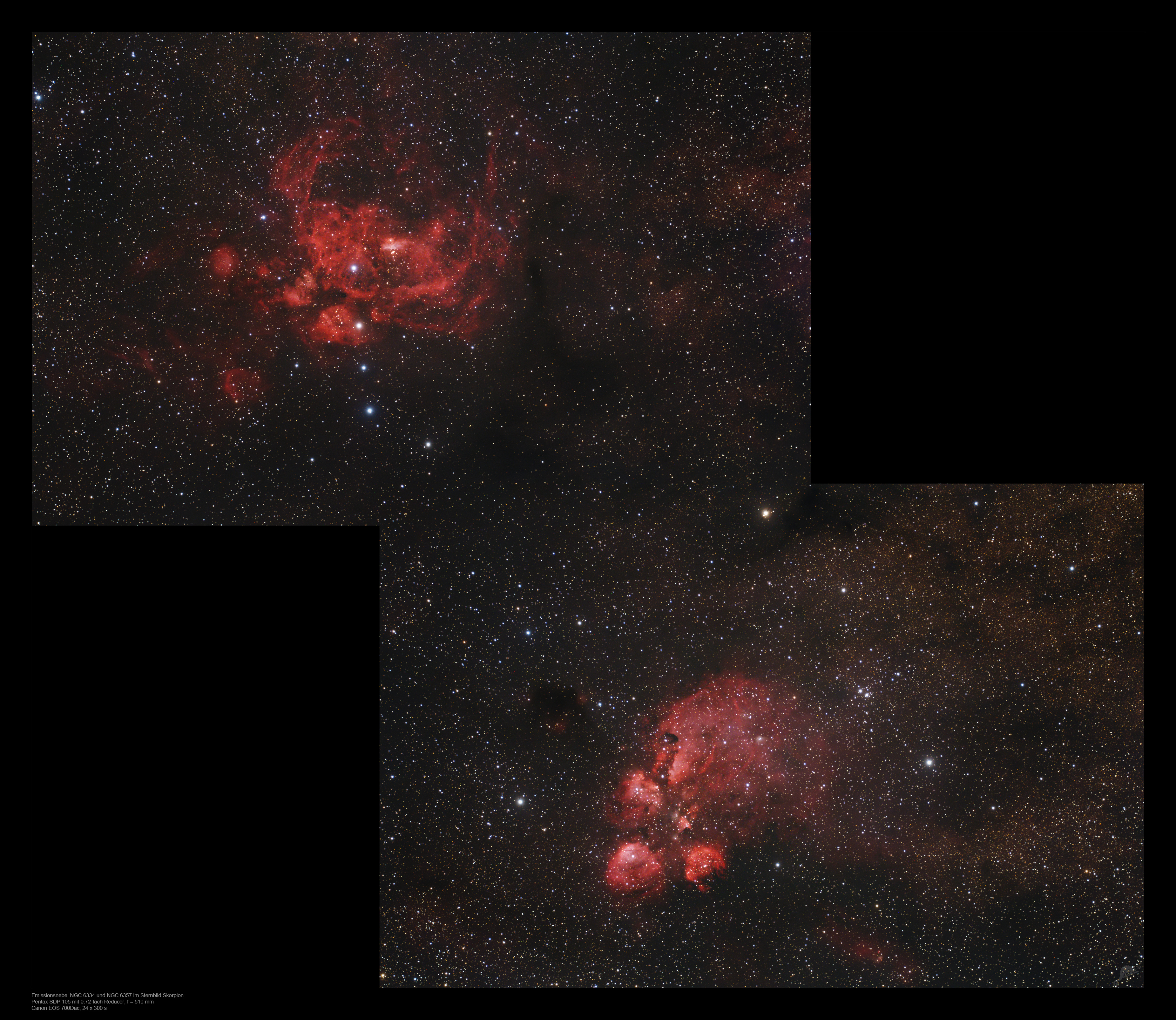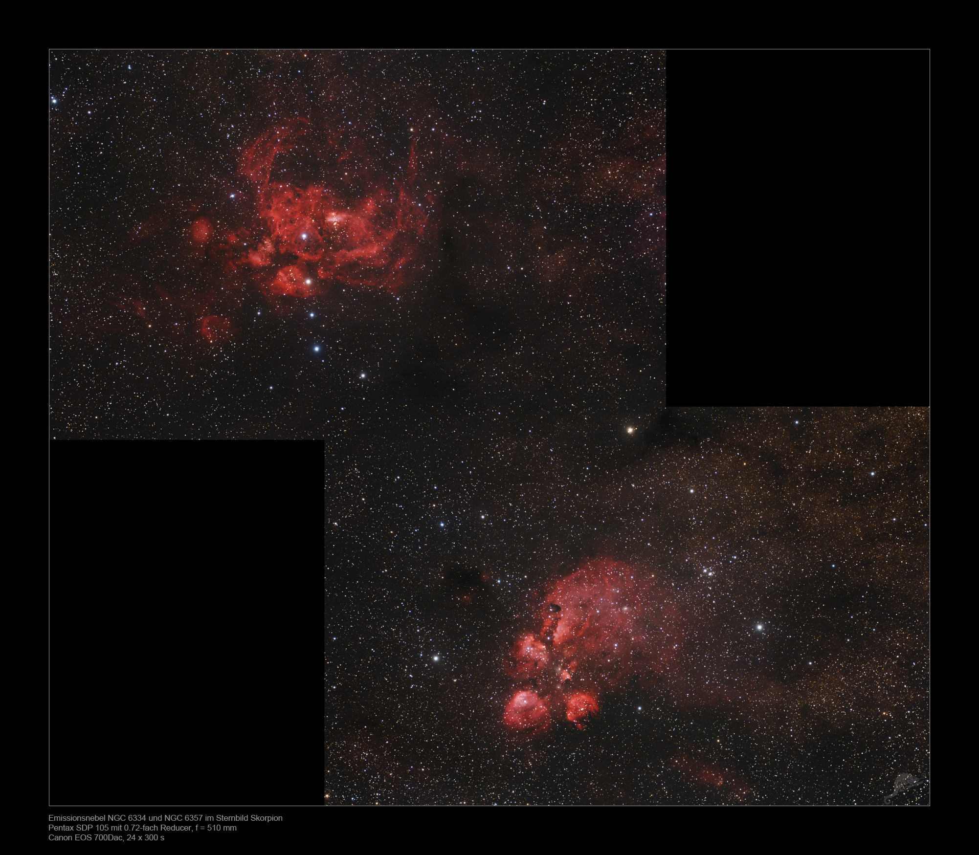 | Objektbeschreibung: Unser 2-er Mosaik zeigt den Katzenpfotennebel (NGC 6334, unten rechts im Mosaik) und den Hummernebel (NGC 6357), aufgenommen mit 500mm Brennweite. Auf den ersten Blick scheint es sich um einen Doppelnebel zu handeln, doch ein Blick auf die Entfernung der beiden H-II Regionen ergibt ein anderes Bild. Sie stehen nur zufällig so dicht zusammen am Himmel, denn NGC 6334 steht etwa 5500- und NGC 6357 etwa 8000 Lichtjahre vom Sonnensystem entfernt. |