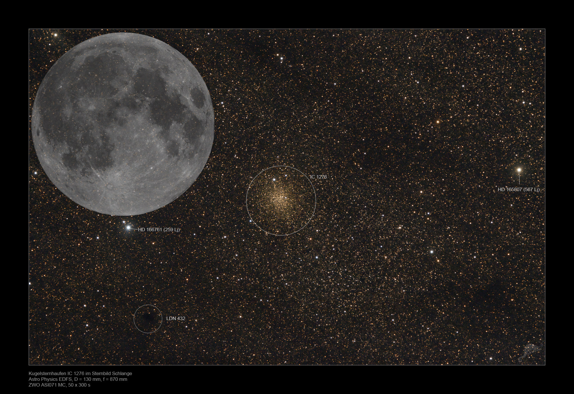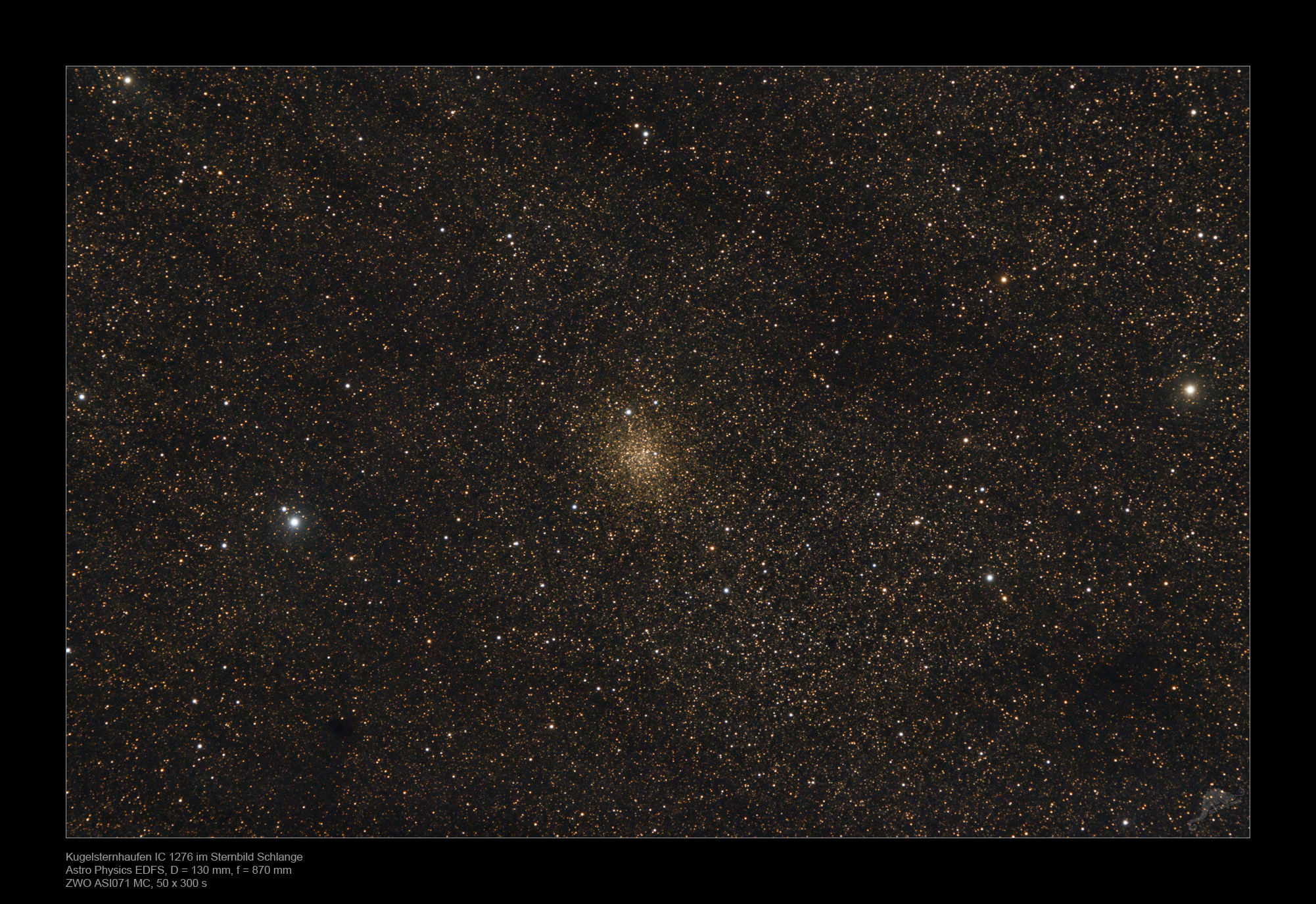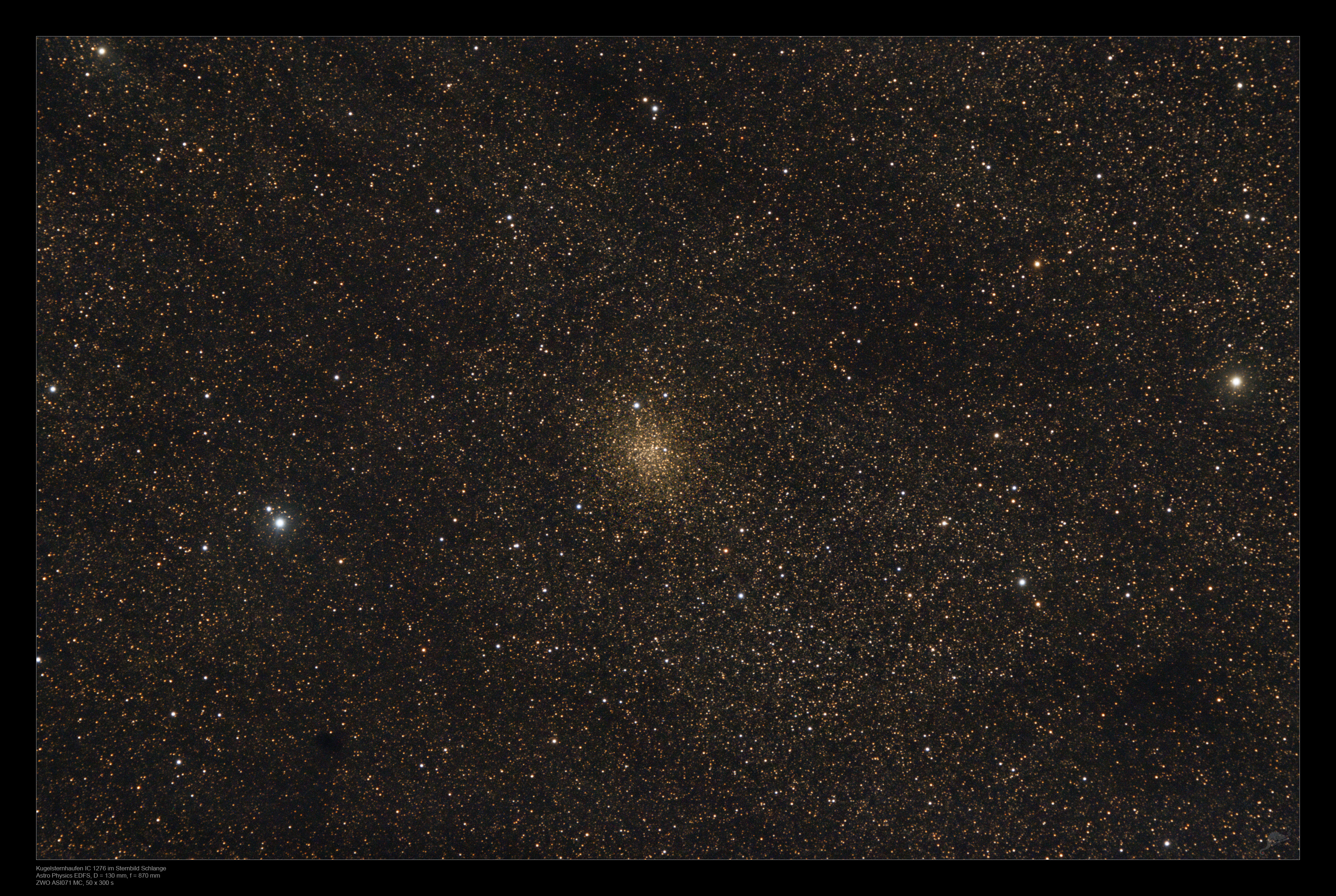 | Objektbeschreibung: IC 1276 (PAL 7) ist ein wenig fotografierter kleiner Kugelsternhaufen im Sternbild Serpens. Mit einem scheinbaren Durchmesser von 7 Bogenminuten wird er nach Shapley der Konzentrationsklasse XII (wenig konzentriert) zugeordnet. Seine Entfernung zum Sonnensystem wird mit etwa 18 000 Lichtjahren angegeben. Vorgelagerte Staub- und Dunkelwolken schwächen nicht nur das Licht der Sterne sondern röten es auch deutlich, so dass die Sterne gelblich erscheinen. Von den 147 bekannten Kugelsternhaufen unserer Galaxis waren bereits 108 im NGC-Katalog enthalten und wurden also visuell entdeckt. Weitere acht kamen später im IC-Katalog dazu. |