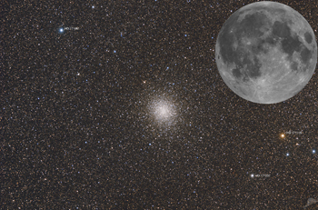 Objektbeschreibung: Messier 22 (NGC 6656) gilt als einer der prächtigsten Kugelsternhaufen des gesamten Himmels. Er steht im Sternbild Schütze und wird an scheinbarer Größe und Helligkeit nur von Omega Centauri (NGC 5139) und 47 Tucanae (NGC 104) übertroffen. Unter dunklem Himmel ist er deutlich mit dem bloßen Auge sichtbar. Mit einer Entfernung von rund 10.500 Lichtjahren ist er auch einer der nächst gelegenen Kugelsternhaufen zum Sonnensystem. Bei einem scheinbaren Durchmesser von 17 Bogenminuten füllt M 22 ein Raumvolumen von knapp 100 Lichtjahren aus. Der Haufen beinhaltet etwa 100.000 Sterne, darunter mehr als 100 veränderliche Sterne und 2 schwarze Löcher mit jeweils 10 bis 20 Sonnenmassen. Nach Shapley wird er der Konzentrationsklasse VII zugeordnet. Dichter, vorgelagerter interstellarer Staub führt zu einer Rötung des Lichtes und lässt die Sterne des Haufen gelblicher erscheinen, als sie es ohne Staub wären. (E(B-V) = 0.34 mag). Ein Großteil der vielen schwachen Sterne in unserem Bild gehört zum so genannten galaktischen Bulge, einer Aufwölbung der Milchstraße um das galaktische Zentrum in rund 27.000 Lichtjahren Entfernung. Von der Erde aus gesehen liegt Messier 22 vor dem Bulge unserer Milchstraße. Im Jahr 48 vor Chr. beobachteten chinesische Astronomen für einige Tage einen neuen Stern im Sternbild Schütze. Für die fernöstlichen Himmelskundler war es ein weiterer Vertreter jener "Gaststerne", die sie immer wieder beobachtet konnten. Erst der modernen Astronomie wurde klar, dass die kurz aufleuchtenden Sterne auf Nova- bzw. Supernovaexplosionen zurück zu führen sind. Im April 2019 publizierte ein internationale Gruppe von Astronomen die Entdeckung des Überrestes der Explosion einer Nova nahe dem Zentrum von M 22. Bei einer Nova entzündet sich Wasserstoff auf der Oberfläche eines Weißen Zwergsterns, wodurch für einige Tage die Helligkeit des Sterns um das Zehntausendfache oder mehr ansteigt. Der Überrest ist ein rötlicher leuchtender Nebel aus Wasserstoff und anderen Gasen mit einem Durchmesser von etwa 8000 Astronomischen Einheiten. Die Masse des Nebels wird auf etwa 30 Erdmassen geschätzt. Diese Entdeckung bestätigte eine der ältesten aufgezeichneten Beobachtungen eines astronomischen Ereignisses außerhalb unseres Sonnensystems. |
