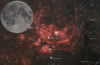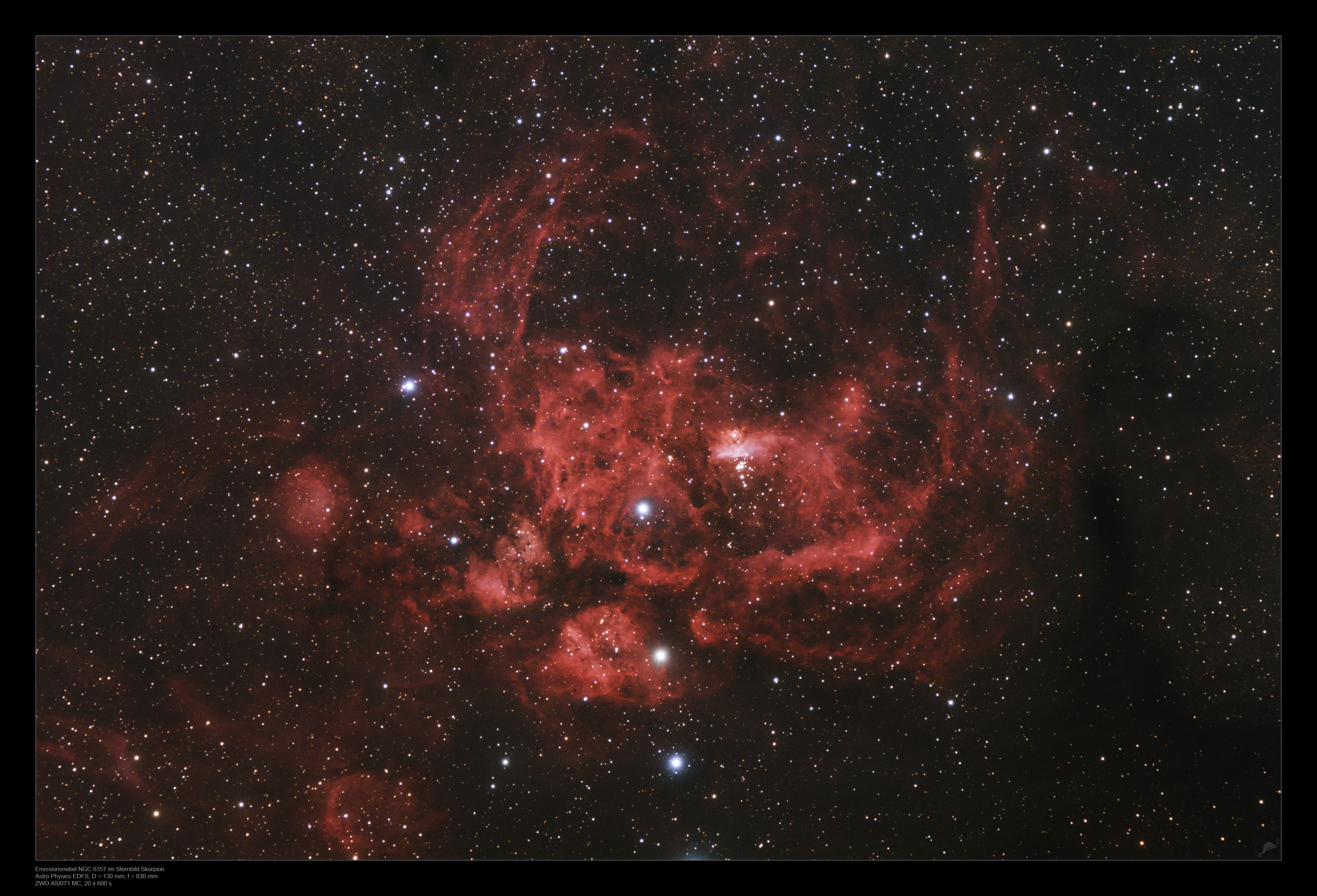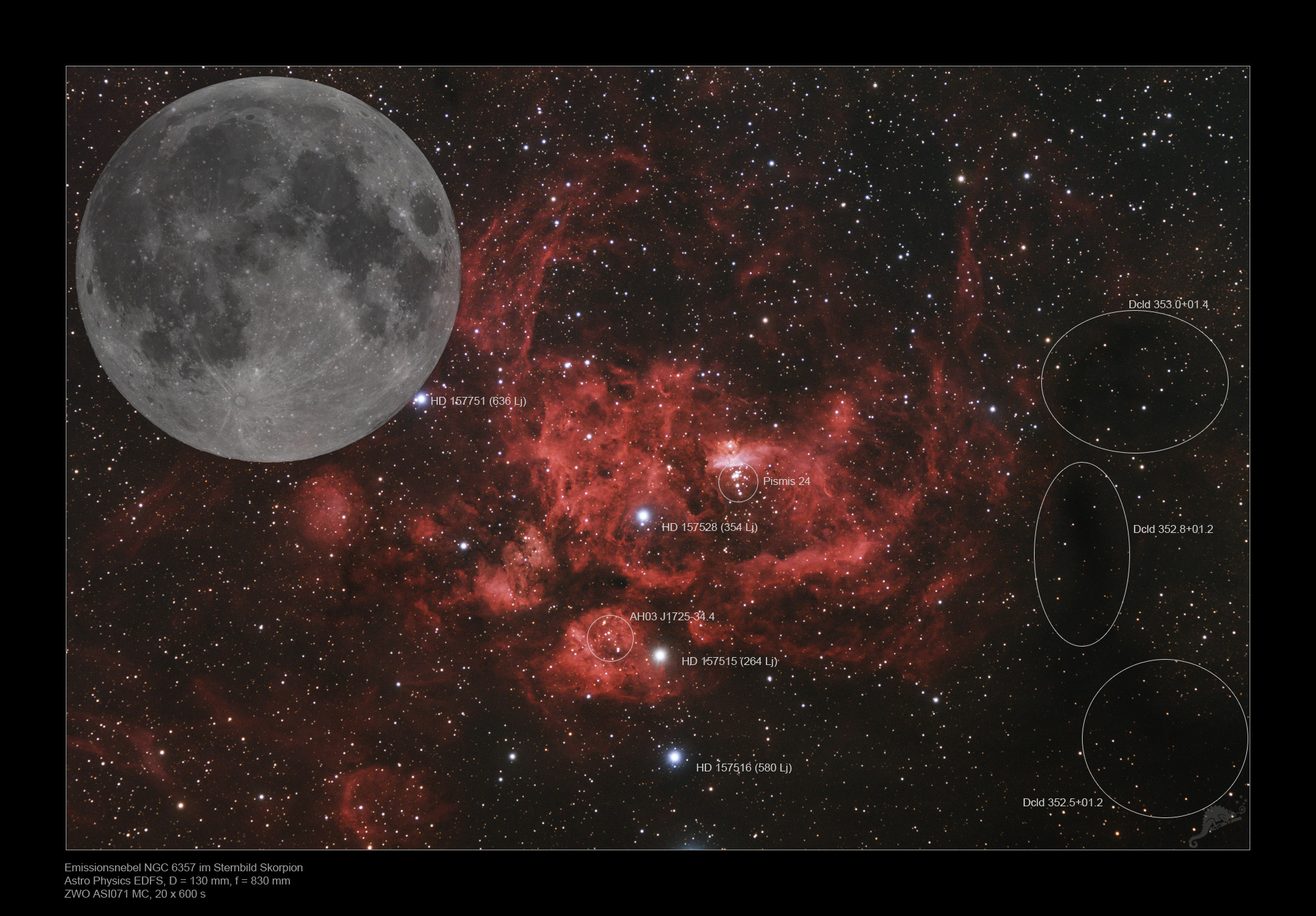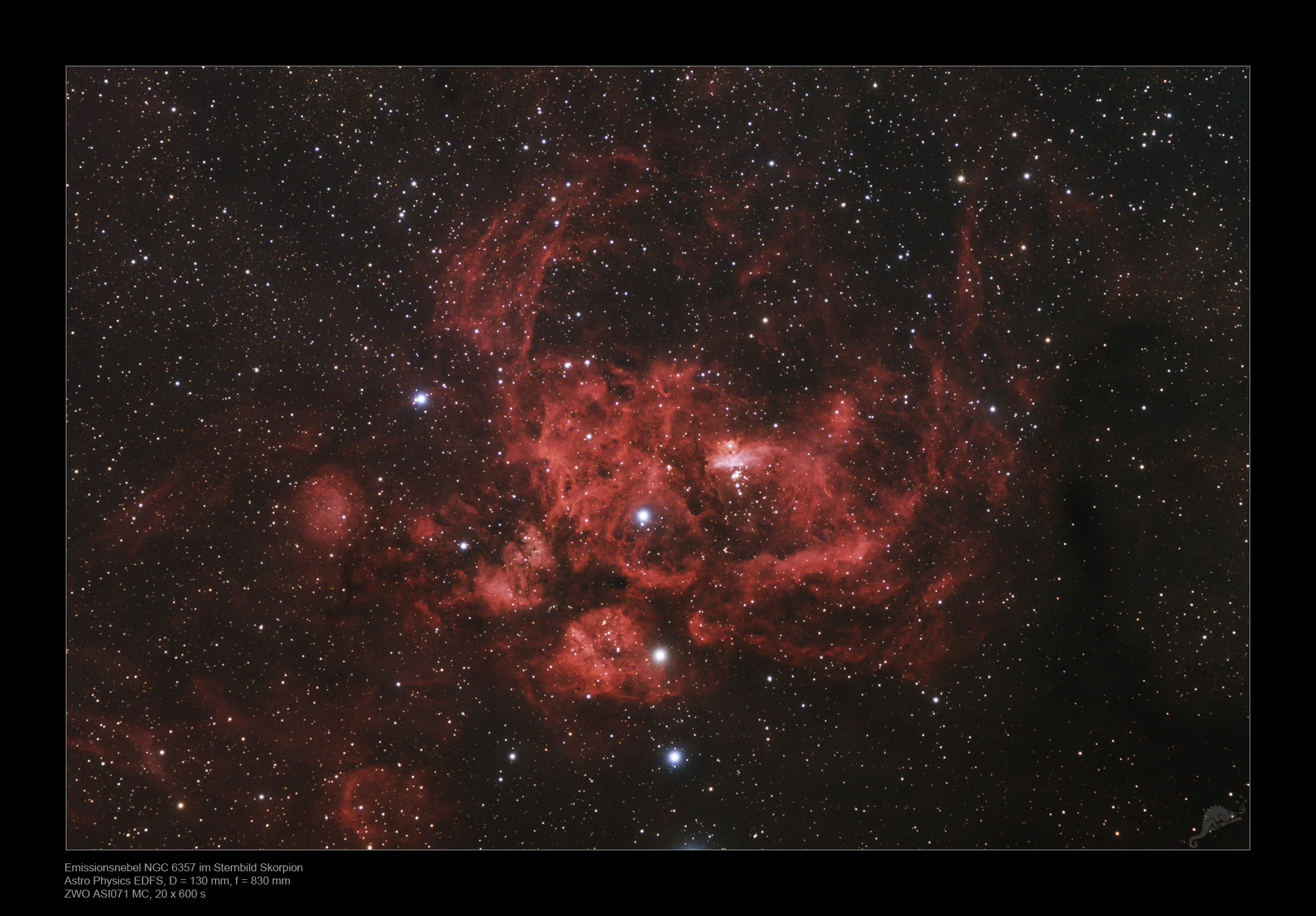 Objektbeschreibung: NGC 6357 - populär auch als Hummer Nebel bezeichnet - ist ein großes Sternentstehungsgebiet im Sternbild Skorpion. Innerhalb dieser von dunklen Staubwolken durchzogenen H-II Region befinden sich einige sehr junge offene Sternhaufen - unter anderem Pismis 24 - deren viele massereichen blauen Sterne mit ihrer extrem starken UV Strahlung das Wasserstoffgas von NGC 6357 zum Leuchten anregt. Zwischen unserem Sonnensystem und der H-II Region liegen in Richtung Zentrum der Milchstraße dichte kalte Staubwolken. Dieser Staub "rötet" das Licht und absorbiert blaue Nebelanteile und so zeigt sich NGC 6357 annähernd gleichmäßig in roter Farbe. Die Nebelregion liegt in einer Entfernung von etwa 8000 Lichtjahren zu unserem Sonnensystem und daraus folgt ein wahrer Durchmesser von etwa 100 Lichtjahren des helleren Teils und 200 Lichtjahren für den äußeren Bereich des Nebels. Entdeckt wurde NGC 6357 von John Herschel am 8. Juni 1837 während seines 5-jährigen Aufenthalts in Kapstadt/Südafrika. Pismis 24 ist einer der jüngsten offenen Sternhaufen in der Milchstraße. Das Alter der Sterne wird auf nur 1- bis 2 Millionen Jahre geschätzt. Der hellste Stern im Haufen - Pismis 24-1 - galt lange Zeit mit einer Gesamtmasse von 200- bis 300 Sonnenmassen als DER massereichste Stern in unserer Galaxie. Nach gängigen Theorien zur Sternentstehung und Sternentwicklungen dürfte es solche massereichen Sterne eigentlich nicht geben. Und so zeigten Beobachten im Jahr 2006 mit dem Hubble Space Teleskop auch, dass Pismis 24-1 ein Doppelstern, eventuell sogar ein 3-fach Sternsystem ist. Bei einem Doppelstern ergäben sich Massen von 70 bis 100 Sonnenmassen und das wäre im Einklang mit den Theorien zur Sternentstehung. Zumindest ein weiterer Stern in Pismis 24 erreicht ebenfalls 70 bis 100 Sonnenmassen. Sterne dieser Größe haben ein kurzes Leben, Pismis 24-1 und Pismis - 24-17 werden in wenigen Millionen Jahren in einer gewaltigen Supernovaexplosion zerrissen werden.