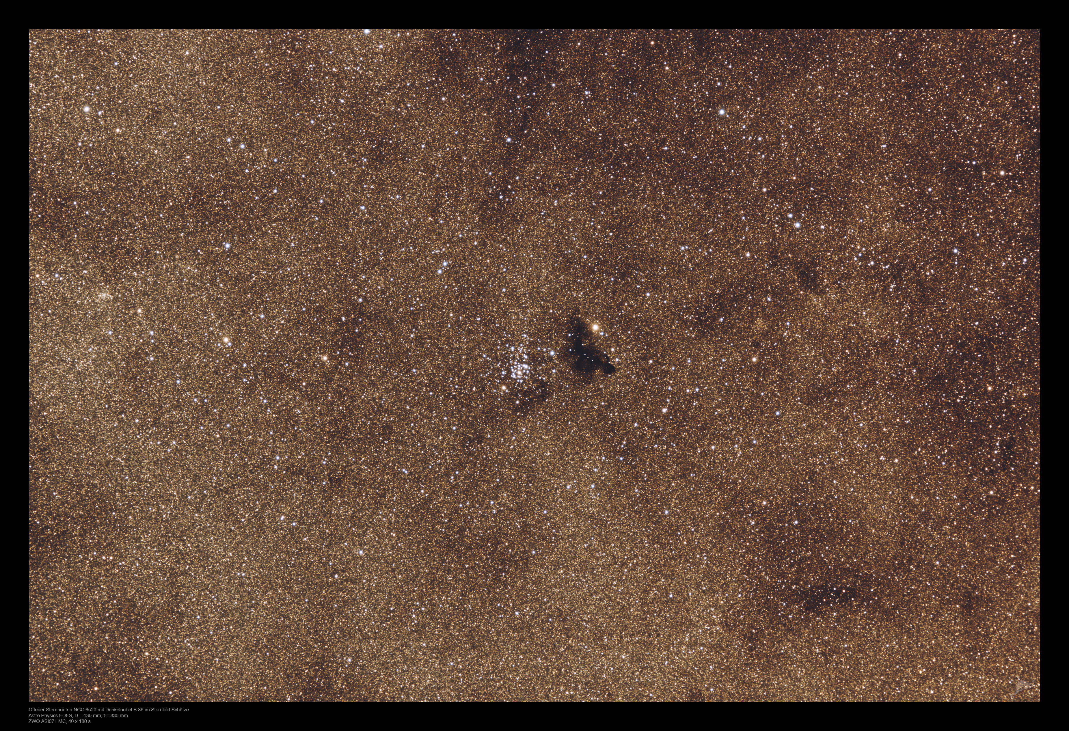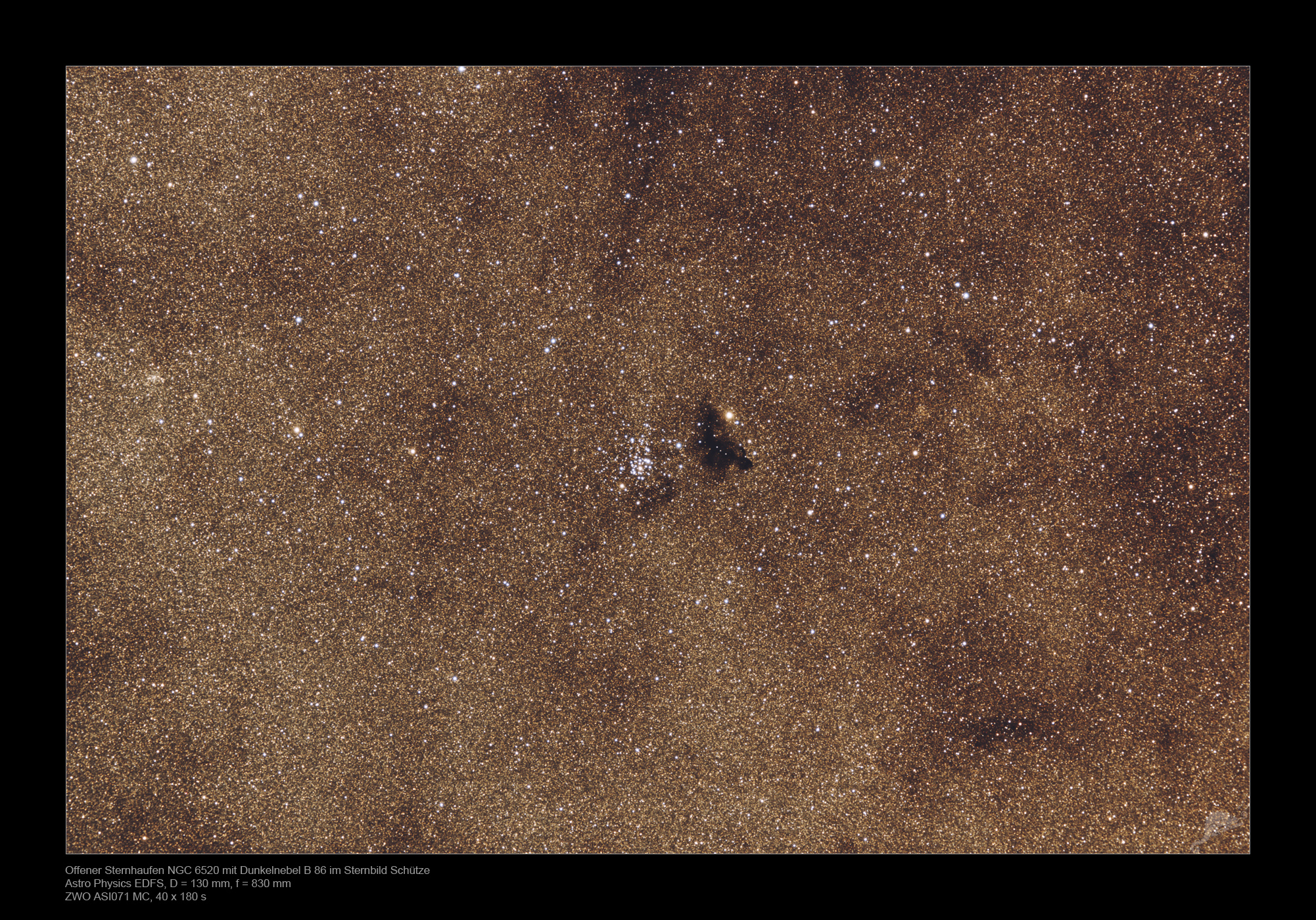 Objektbeschreibung: NGC 6520 und die Bok Globule Barnard 86 Unser Bild zeigt den hellen offenen Sternhaufen NGC 6520 und seine seltsame Nachbarin, die entfernt an die Silhouette eines Geckos erinnernde Dunkelwolke Barnard 86. Das kosmische Pärchen steht vor dem Hintergrund aus Millionen leuchtender Sterne im hellsten Teil unserer Milchstraße. Die Sterne der Milchstraße in dieser Himmelsregion stehen so dicht gedrängt, dass kaum noch dunkler Himmel zwischen ihnen zu sehen ist. Dieser Teil des Sternbildes Schütze (Sagittarius) beherbergt eines der am dichtesten bevölkerten Sternfelder am gesamten Himmel - die große Sagittarius Sternwolke. Durch die Vielzahl heller Sterne entsteht ein dramatischer Kontrast zu schwarzen Dunkelwolken wie Barnard 86 im Zentrum dieses Bildes, in einer Weitwinkelansicht aufgenommen mit unserem 5 Zoll EDFS Refraktors. Barnard 86, eine so genannte Bok-Globule, wurde von seinem Entdecker Edward Emerson Barnard als "Tropfen Tinte auf hellem Sternhintergrund" beschrieben. Barnard war ein amerikanischer Astronom, der neben zahlreichen weiteren Beiträgen zur Wissenschaft auch eine große Zahl von Kometen, Dunkelwolken sowie einen Jupitermond entdeckte und fotografierte. Als außergewöhnlich begabter visueller Beobachter und Astrofotograf war Barnard der erste, der Langzeitbelichtungen zur Untersuchung von Dunkelwolken anfertigte. Barnard nahm das Objekt 1905 in seinen Katalog von Dunkelnebeln auf. Barnard 86 liegt von der Erde aus betrachtet vor dem Sternfeld. Die kleinen Staubkörner, aus denen die kalte und dichte Dunkelwolke besteht, absorbieren das Licht der dahinter liegenden Sterne und machen die Wolke undurchsichtig. Vermutlich sehen wir hier die Überreste der Molekülwolke, bei deren Kollaps der nahe gelegene Sternhaufen NGC 6520 entstanden ist. Die wenigen Sterne, die auf dem Bild scheinbar mitten in Barnard 86 stehen, befinden sich in Wahrheit im Vordergrund, also zwischen uns und der Dunkelwolke. Als junger offener Sternhaufen enthält NGC 6520 viele heiße Sterne. Ihr blau-weißes Leuchten verrät ihr geringes Alter. Üblicherweise bestehen offene Sternhaufen aus einigen tausend Sternen, die sich zur selben Zeit gebildet haben und daher gleich alt sind. Die Haufen selbst bleiben meistens nur eine vergleichsweise kurze Zeit - einige hundert Millionen Jahre - zusammen, bevor sie langsam auseinanderdriften. Das Alter der Sterne in NGC 6520 wird auf "nur" 150 Millionen Jahre geschätzt. Er wird nach Trumpler der Klasse I 2 m zugeordnet. Zusammen mit Barnard 86 steht der Sternhaufen in einer Entfernung von knapp 2000 Lichtjahren zu unserem Sonnensystem. NGC 6520 wurde am 24. Mai 1784 von Friedrich Wilhelm Herschel entdeckt. |