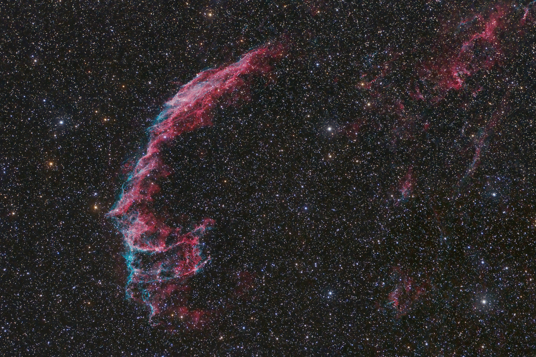 | Objektbeschreibung: Der Cirrusnebel ist das Musterbeispiel eines Supernovaüberrests und hat einen scheinbaren Durchmesser von 3 Grad am Himmel. Unser Bild zeigt das östliche Hauptsegment, bestehen aus NGC 6992, 6995 und IC 1340. Das bei der Supernovaexplosion hinaus geschleuderte Gas expandiert und breitet sich mit rund 180 Kilometern pro Sekunde, das sind nahezu 600 000 Kilometer pro Stunde, nahezu kugelförmig aus. Dabei stößt es mit dem umgebenden interstellaren Medium zusammen, heizt sich dabei auf mehrere Millionen Grad auf und formt dabei ein Gebilde aus leuchtenden Filamenten und Nebelfetzen. Je nach dem in den in den Überresten der Sternexplosion vorhandenen chemischen Elemente wird das Gas ionisiert und beginnt zu leuchten. Im Fall des Cirrusnebels leuchten die Elemente Wasserstoff, Stickstoff und Schwefel in roten und der dreifach ionisierte Sauerstoff in blaugrün/türkis Farbtönen. |