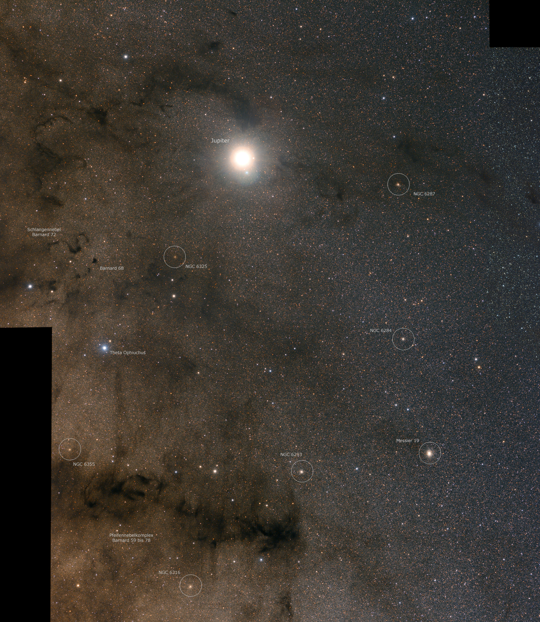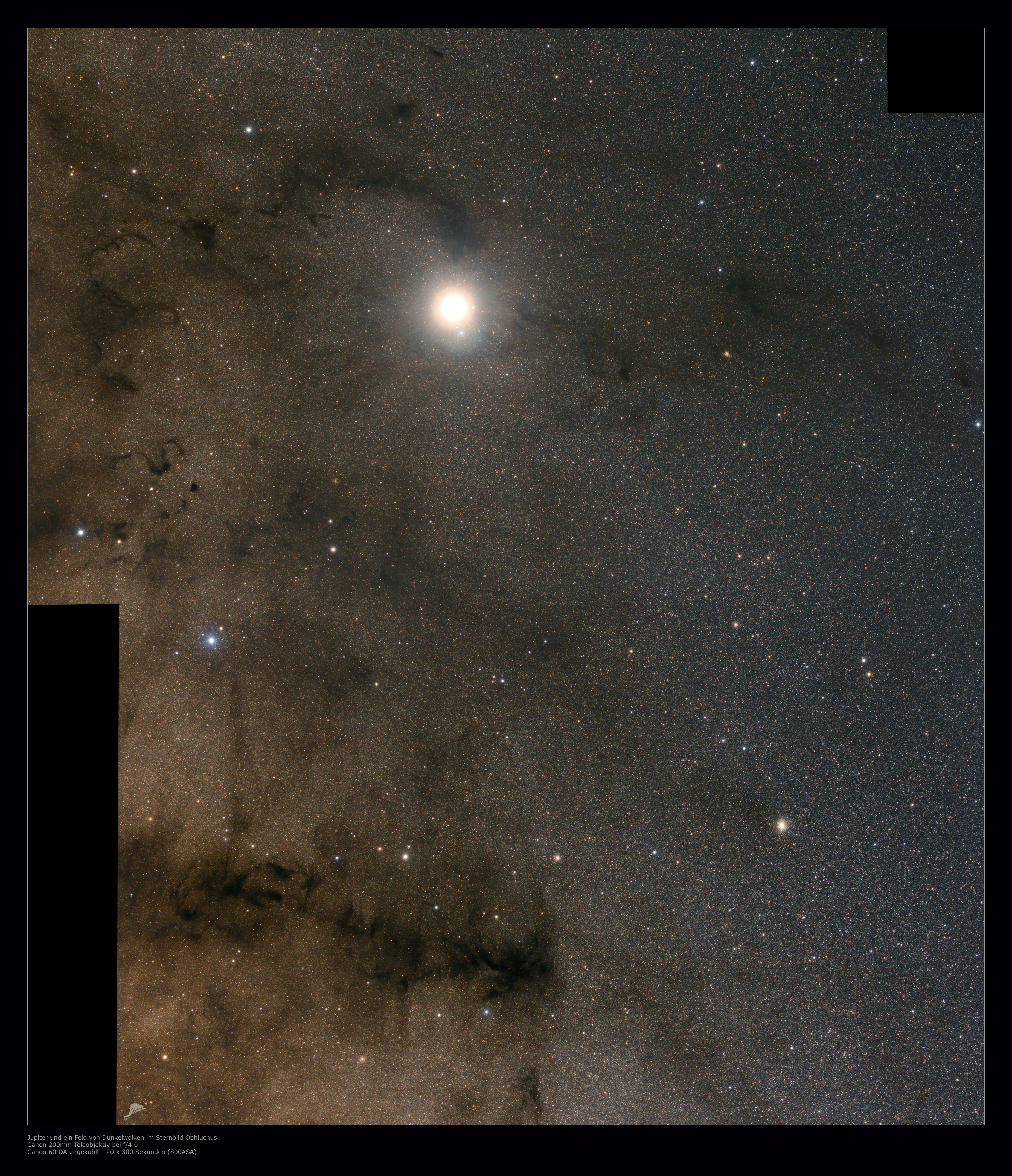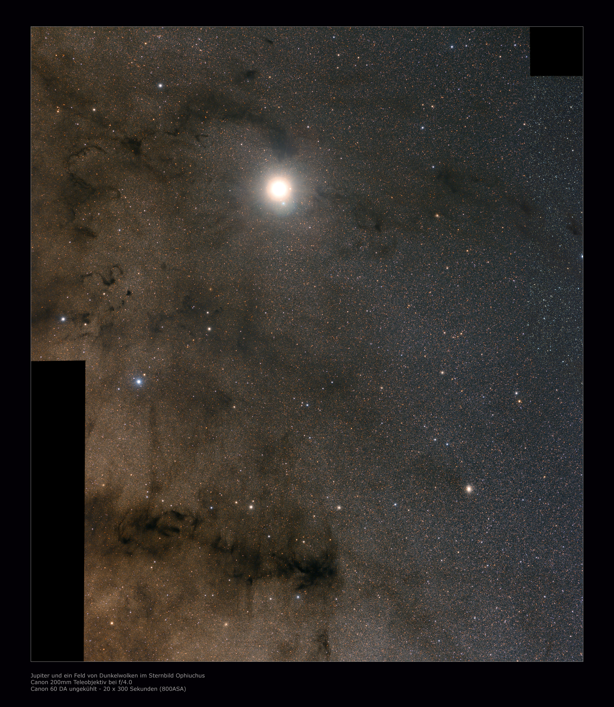 | Objektbeschreibung: Unser Bild zeigt ein 2-teiliges Mosaik von einigen großen Dunkelwolken im Sternbild Ophiuchus zusammen mit dem Planeten Jupiter. Bildorientierung: Norden oben und Osten links. Im Schlangenträger liegen zahlreiche, große Dunkelwolken, die zunächst fotografisch vom amerikanischen Astronomen Edward Emerson Barnard katalogisiert wurden. Den kompletten Katalog von über 300 Dunkelwolken von Barnard findet man unter dieser URL. Barnard war Autodidakt und einer der Pioniere der Astrofotografie. In neuerer Zeit folgten ausführlichen Untersuchungen von K. Dobashi im infraroten Licht. Als Dunkelwolken oder Dunkelnebel werden große Ansammlungen von interstellarer Materie bezeichnet, die entweder das Licht dahinter liegender Sterne absorbieren (z.B. der Kohlensack) oder wenn Sie Teilbereiche von H-II Regionen oder Reflexionsnebel abdecken (z.B. Barnard 33, der Pferdekopfnebel im Sternbild Orion). Die Form solcher Dunkelwolken ist meist irregulär und ohne klar definierte Außengrenzen. Viele der Dunkelwolken haben Eigennamen, wie z.B. der Schlangen- oder der Pfeifennebel. |
