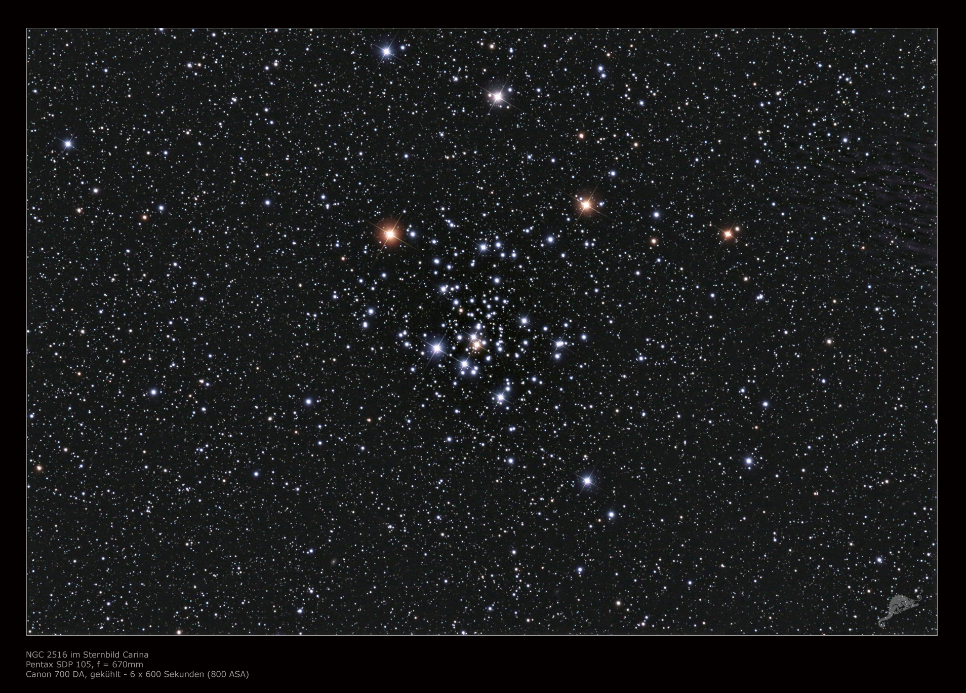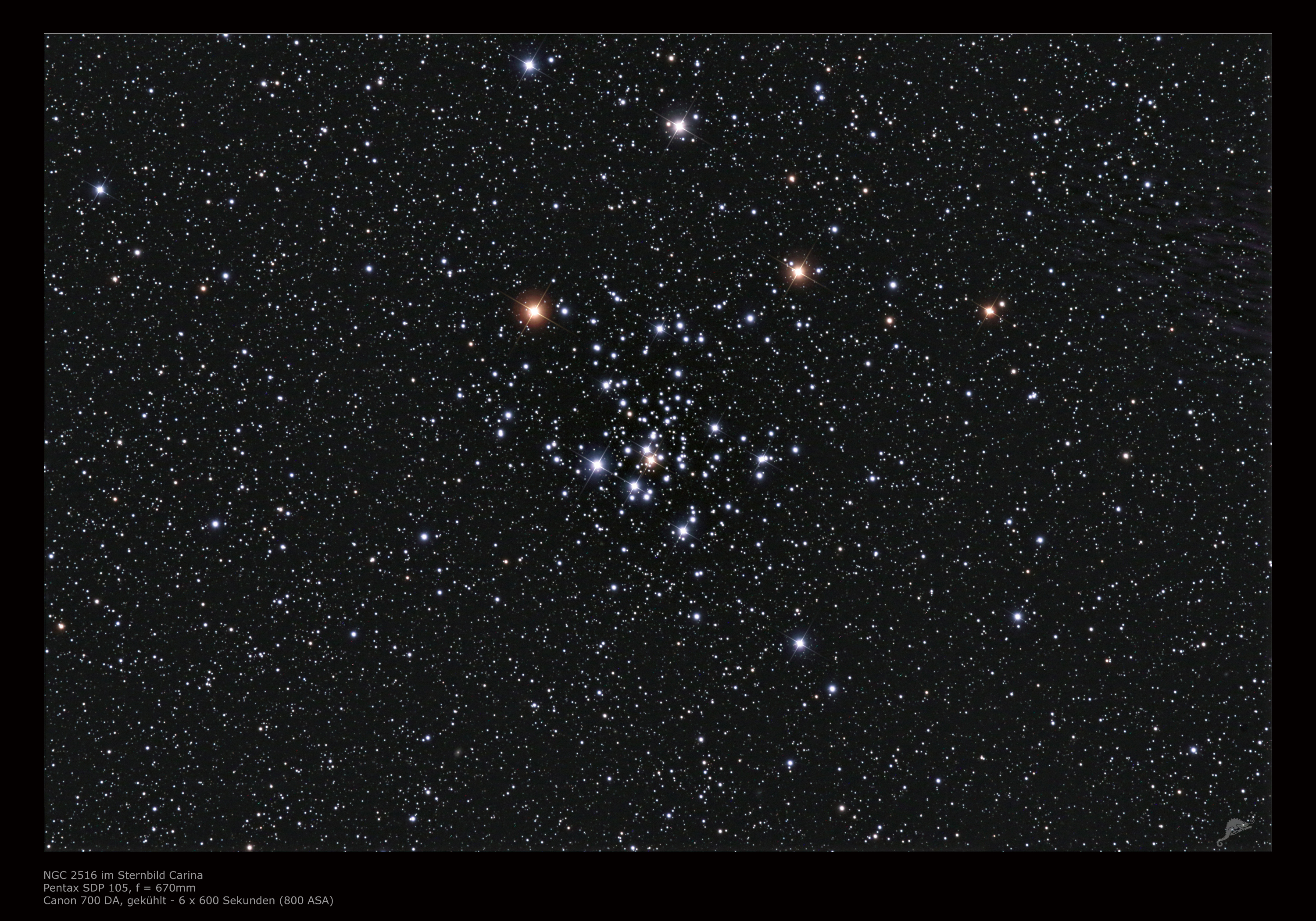 | Objektbeschreibung: NGC 2516 ist ein offener Sternhaufen im Sternbild Carina (Kiel des Schiffs). Sein scheinbarer Durchmesser am Himmel beträgt ungefähr 30 Bogenminuten, das entspricht etwa der Größe des Vollmondes mit dem bloßen Auge betrachtet. NGC 2516 ist bietet bei niedrigen Vergrößerungen visuell einen atemberaubenden Anblick im Teleskop, ähnlich Herschels Schmuckkästchen NGC 4755. Er beinhaltet etwa 80 bis 100 Sterne wovon die hellsten im Kernbereich Rote Riesensterne der 5. Größenklasse sind. Diese roten Riesen stehen am Ende ihres Lebens, obwohl das Gesamtalter des Sternhaufens nur auf 135 Millionen Jahre geschätzt wird. Die restlichen Sterne haben Helligkeiten der 7. Größenklasse und schwächer. NGC 2516 wird nach Trumpler als Typ I 3 r klassifiziert. Seine Entfernung zum Sonnensystem beträgt ungefähr 1300 Lichtjahre, bei einem scheinbaren Durchmesser von 30 Bogenminuten entspricht dies real etwa 12 Lichtjahre. Entdeckt wurde NGC 2516 im Jahr 1751 von dem französischen Astronomen Nicolas Louis de Lacaille |
