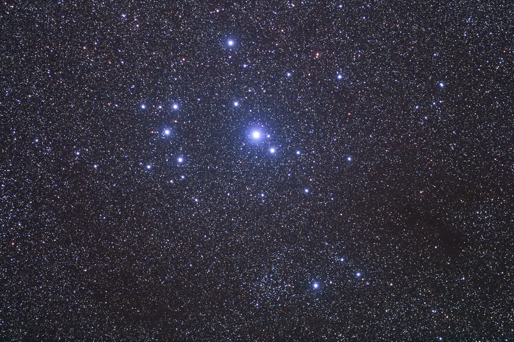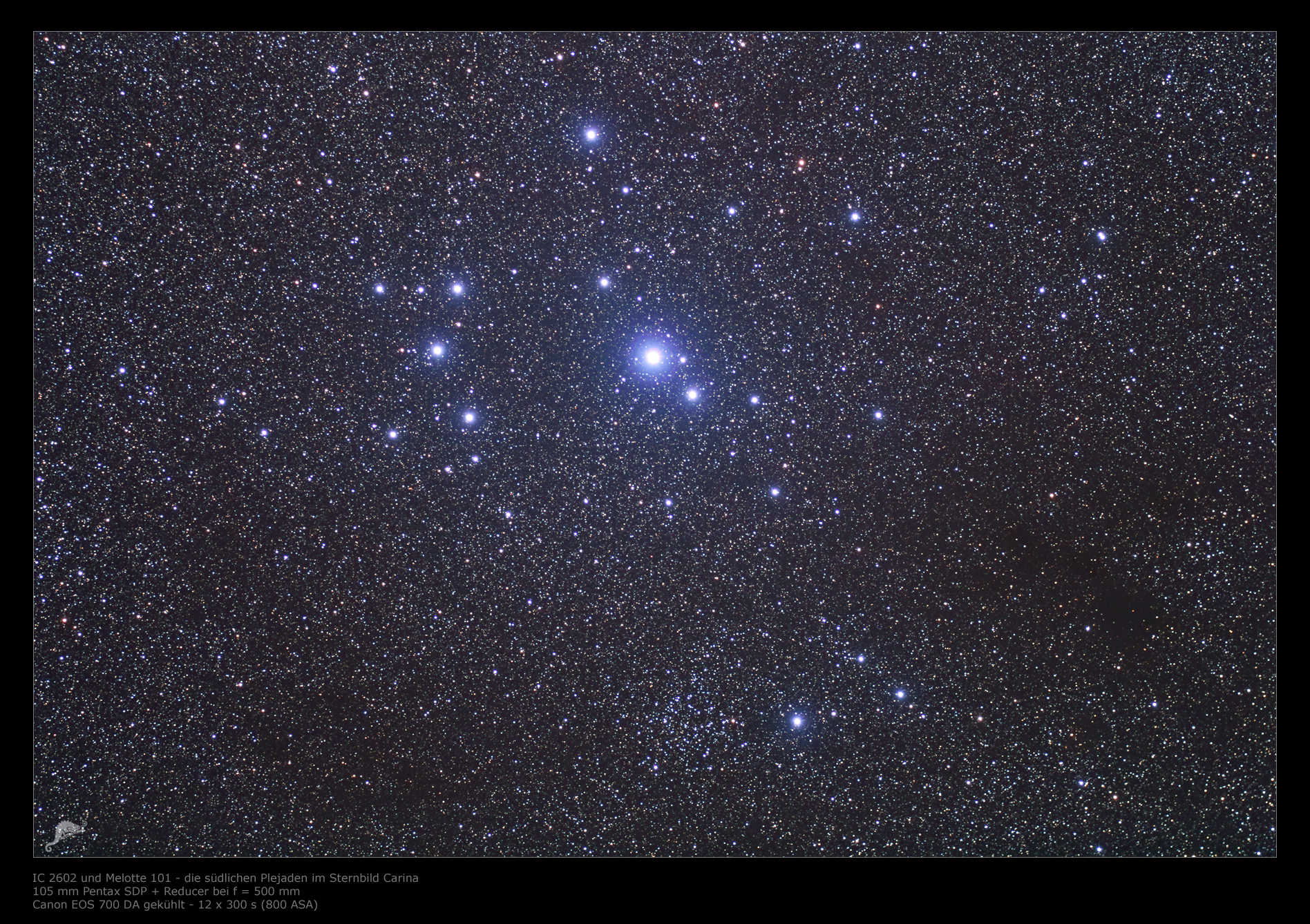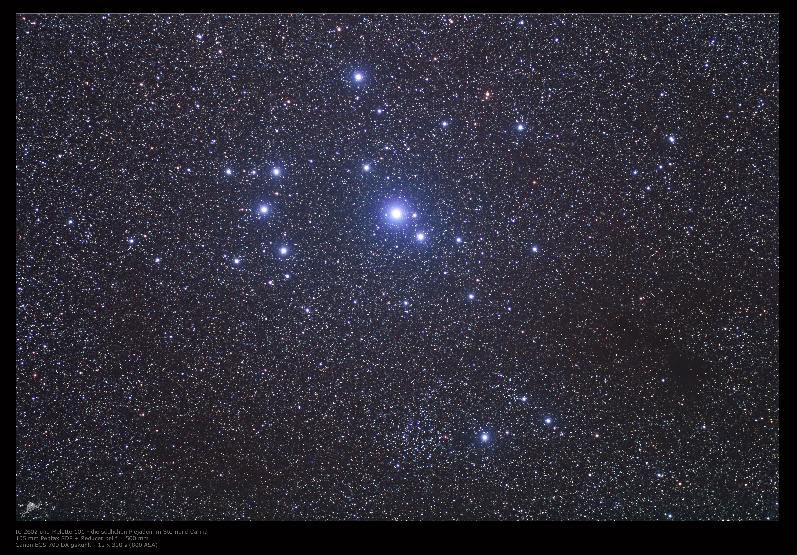 | Objektbeschreibung: Vor dem Hintergrund der südlichen Milchstraße im Sternbild Schiffskiel schwebt in unserer Aufnahme der offenen Sternhaufen IC 2602. Der Haufen befindet sich in einer Entfernung von rund 480 Lichtjahren zum Sonnensystem und ist damit einer der nächsten offenen Sternhaufen. Der scheinbare Durchmesser beträgt rund 50 Bogenminuten, damit erscheint der Haufen deutlich ausgedehnter als der Mond am Himmel. Aus seinem scheinbaren Durchmesser und seiner Entfernung ergibt sich ein wahrer Durchmesser von etwa 10 Lichtjahren. Der hellste Stern von IC 2602 ist Theta Carinae mit einer Helligkeit von 2.8 mag, der Spektralklasse B0, einer Entfernung von 455 Lichtjahren und etwa der 75-fachen Leuchtkraft unserer Sonne. Das Alter des Sternhaufens wird auf etwa 50 Millionen Jahre geschätzt. Nach Trumpler wird er der Klasse II 3 m zugeordnet. Die Gesamtanzahl der Sterne von IC 2602 beträgt etwa 60 Sterne. Aufgrund seiner markanten Erscheinung wird der Haufen auch als die "südliche Plejaden" bezeichnet, auch wenn er nicht an den Durchmesser und die Helligkeit seines nördlichen Gegenparts heran kommt. Entdeckt wurde das Objekt 1751 vom französischen Astronomen Nicolas-Louis de Lacaille. |