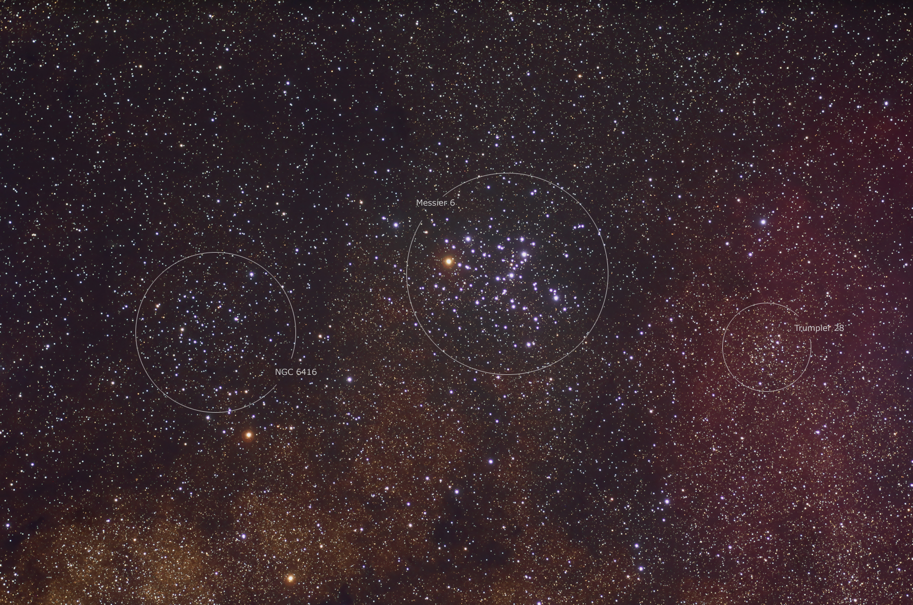 | Messier 6, NGC 6416 und Trumpler 28 im Sterbild