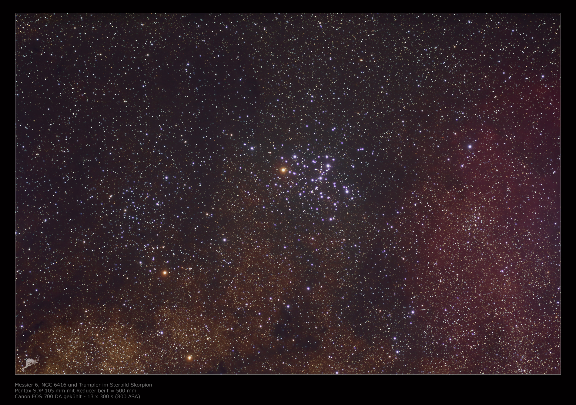 | Objektbeschreibung: Messier 6 (NGC 6405) ist ein heller und großer offener Sternhaufen im Sternbild Skorpion. Der rund 100 Millionen Jahre alte Sternhaufen ist rund 1.600 Lichtjahre von der Erde entfernt. Mit einem scheinbaren Durchmesser von knapp 30 Bogenminuten ergibt sich aus der Entfernung ein wahrer Durchmesser von 12 Lichtjahre. Er wird nach Trumpler der Klasse III 2 p zugeordnet. Der hellste, rötliche Stern innerhalb von M 6 ist der Veränderliche BM Scorpio (HD 160 371). Er gehört wohl nicht zum Sternhaufen sondern ist mit einer Entfernung von knapp 1.000 Lichtjahren wohl ein Vordergrundstern der Spektralklasse K III 3. Messier 6 wurde in der Zeit um 1654 vom italienischen Astronomen Giovanni Battista Hodierna entdeckt, war aber wohl schon in der Antike bekannt. Vermutlich hat bereits Claudius Ptolemäus den Sternhaufen bei seiner Beobachtung von Messier 7 gesehen. Aufgrund der Verteilung der Sterne hat M 6 auch den Beinamen "Schmetterlingshaufen". |