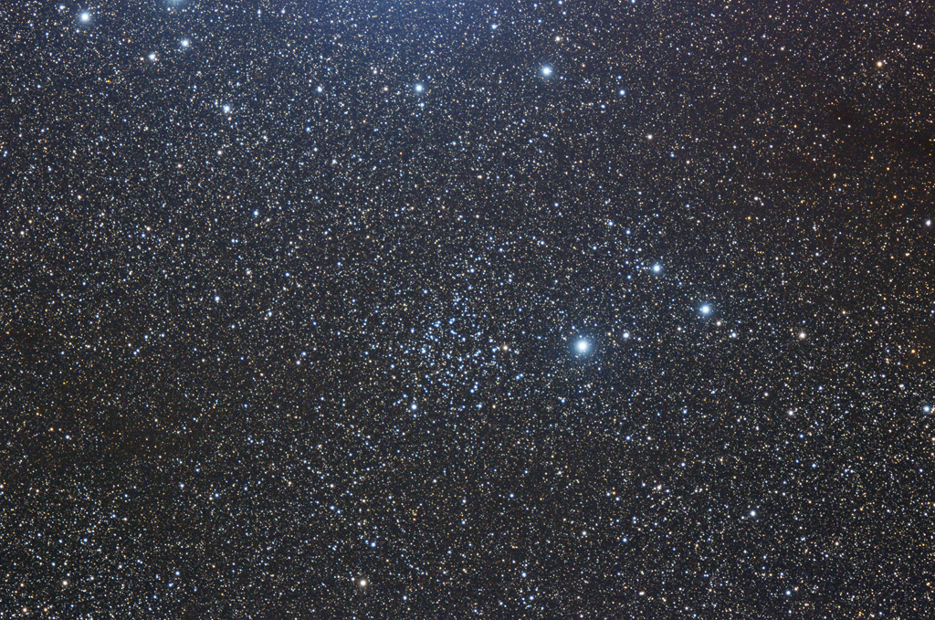 | Objektbeschreibung: Melotte 101 liegt nur etwa 40 Bogenminuten südlich von IC 2602. Der Sternhaufen hat einen scheinbaren Durchmesser von 15 Bogenminuten und beinhaltet etwa 50 Sterne der 10. bis 12. Größenklasse. Seine Entfernung beträgt knapp 7.000 Lichtjahre zum Sonnensystem und daraus ergibt sich ein wahrer Durchmesser von ungefähr 25 Lichtjahre. Die Sterne sind mit etwa 65 Millionen Jahre etwas älter als die Sterne von IC 2602. Das blaue Streulicht obn im Bild stammt vom hellen Stern Theta Carinae innerhalb von IC 2602. Eine Weitwinkelansicht von IC 2602 und Melotte 101 zeigen wir hier |