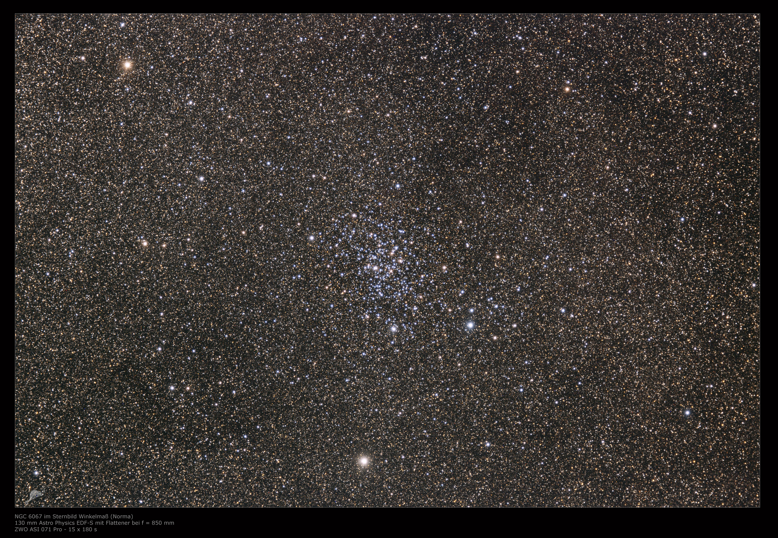 | Objektbeschreibung: NGC 6067 ist auch - visuell betrachtet - ein wunderschöner, konzentrierter offener Sternhaufen und ein Highlight im Sternbild Norma (Winkelmaß). Er beinhaltet etwa 100 Sterne der 10. Größenklasse und schwächer. Nach Trumpler wird er als Typ der Klasse I 2 r klassifiziert. Der Sternhaufen hat spektralen Untersuchungen zufolge ein Alter von etwa 90 Millionen Jahren. Innerhalb des Haufens befindet sich der massereiche Planetarische Nebel PK 329.5-02.2, der aber auf Grund seines geringen Durchmessers in unserem Bildmaßstab nicht sichtbar ist. Die Entfernung zum Sonnensystem beträgt geschätzt etwa 4.600 Lichtjahre. Entdeckt wurde NGC 6067 am 8. Mai 1826 von James Dunlop, einem schottischen Astronomen der von Australien aus beobachtete. |