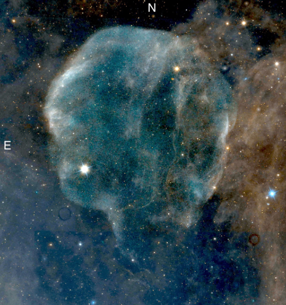 Supernovaüberrest. Deutlich hebt sich im Westen auch die bräunliche