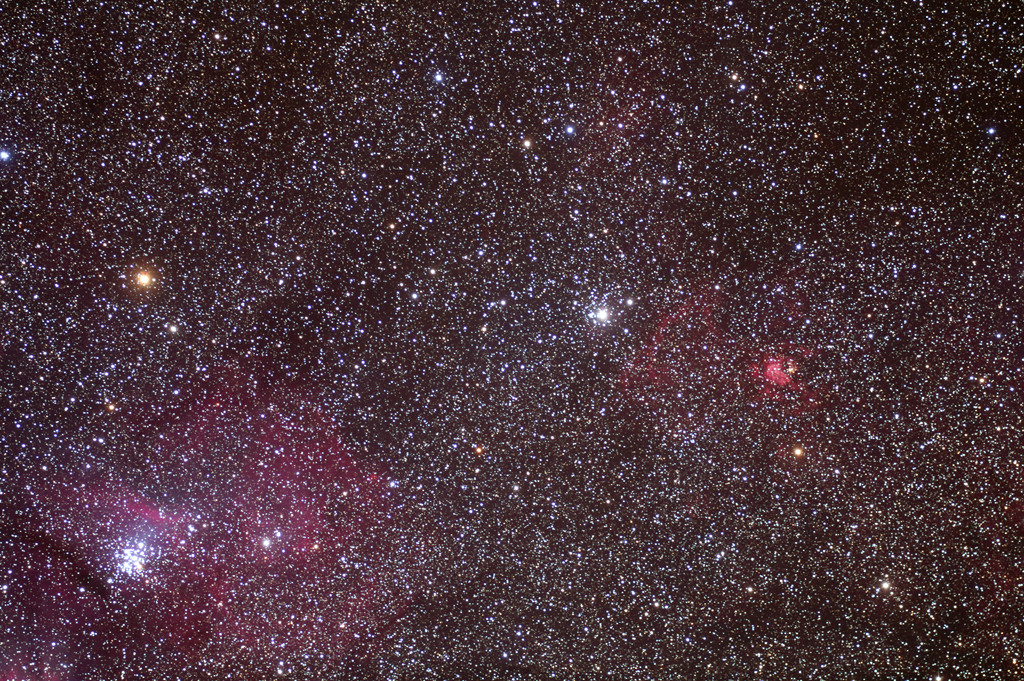 | Objektbeschreibung: GN 10.22.0 - Gum 29 (Westerlund Nebel) und die Nebelgebiete um den offenen Sternhaufen 3293 Annähernd in Bildmitte steht der kleine, sehr helle offene Sternhaufen IC 2581. Rechts daneben (westlich) liegt der Sternhaufen Wetserlund 2, umgeben von dRegion Gum 29. Links unten im Bild steht der junge offene Sternhaufen NGC 3293, umgeben von Reflexionsnebeln und H-II Regionen. Er gehört zum Eta Carina Komplex. |