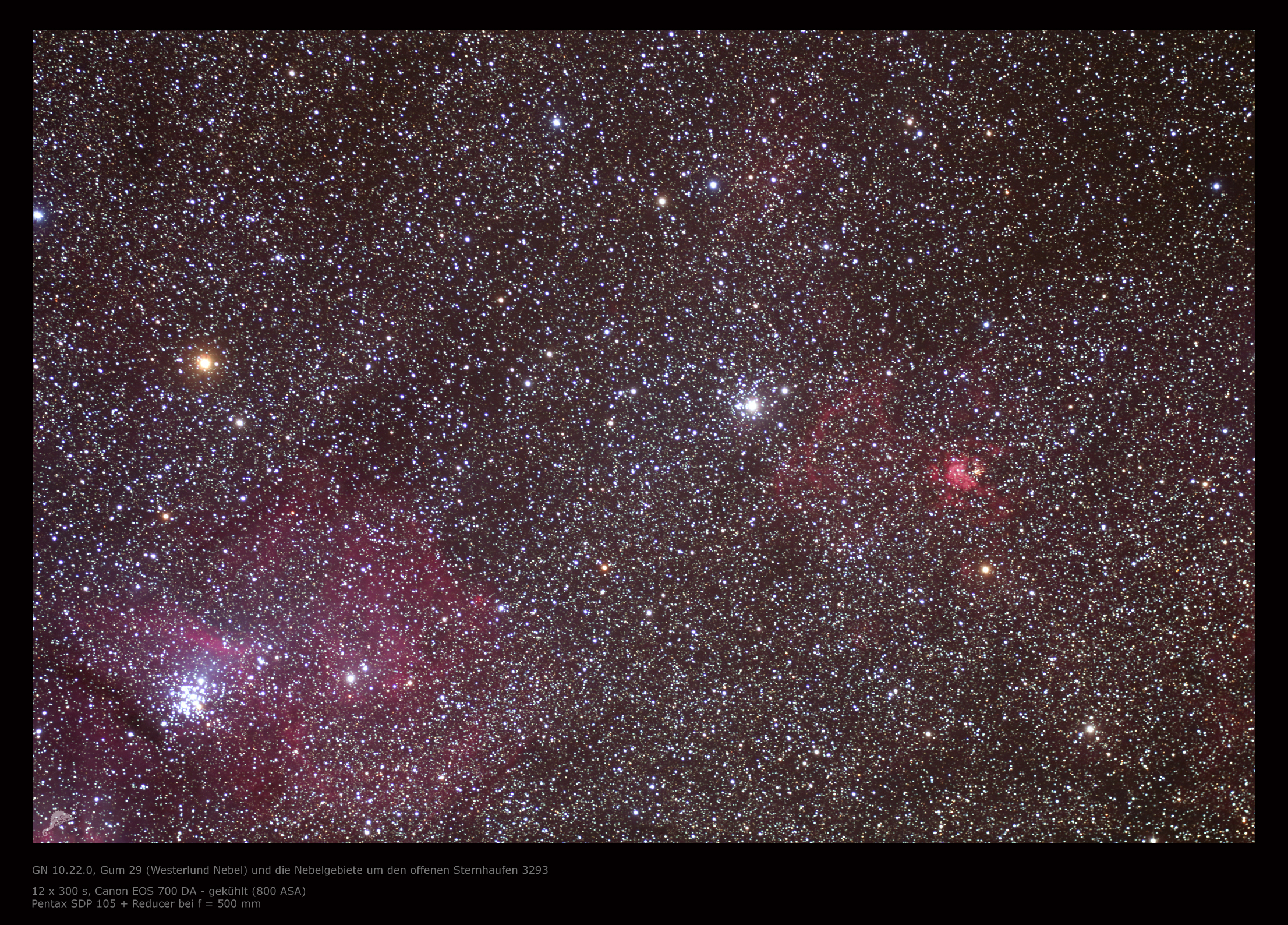 um den offenen Sternhaufen 3293 GN 10.22.0 - Gum 29 (Westerlund Nebula) and the nebula regions around the open star cluster 3293 |