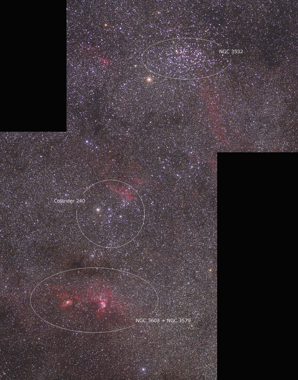 Ein Mosaik von NGC 3532 über Collinder 240 bis zu NGC