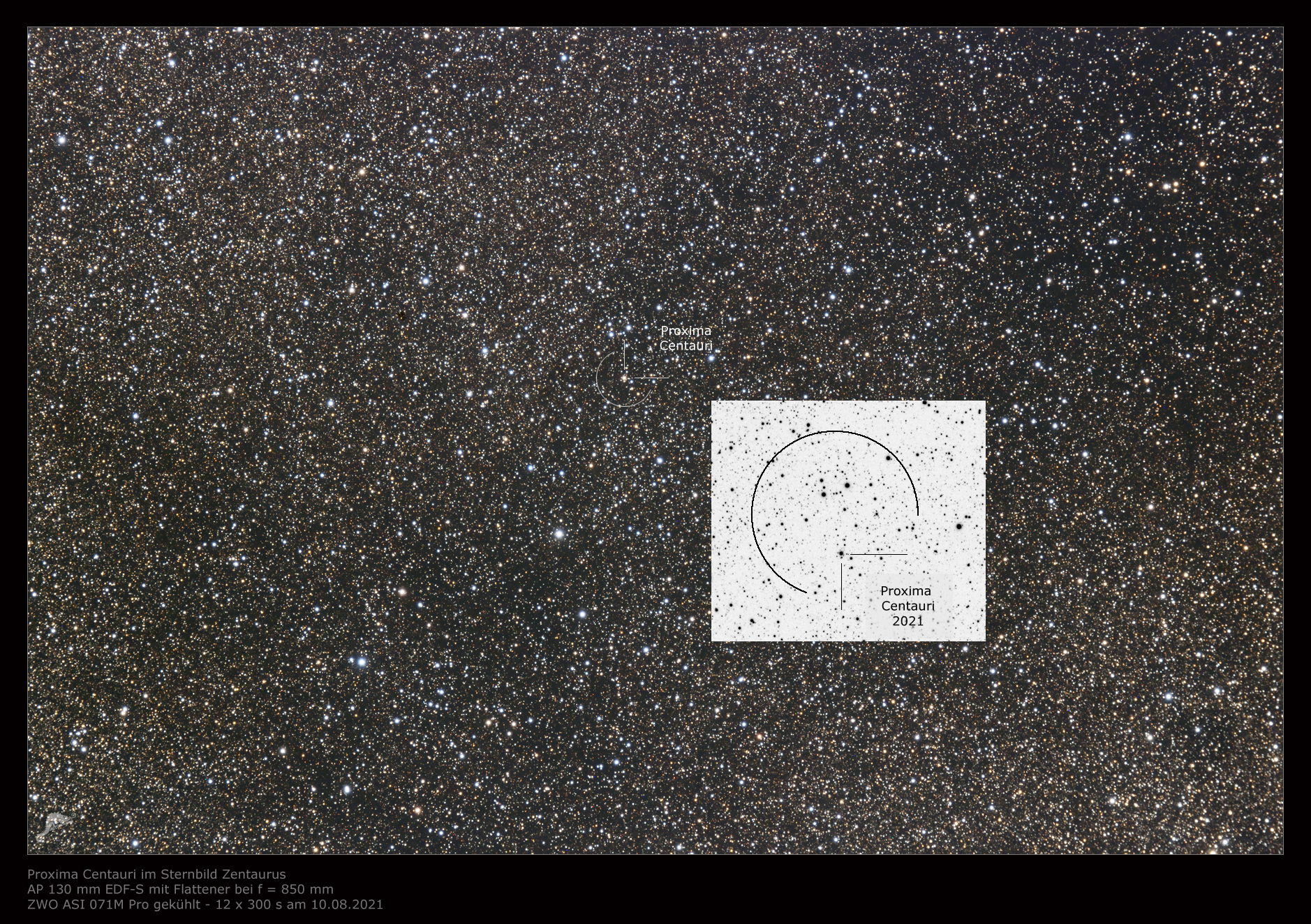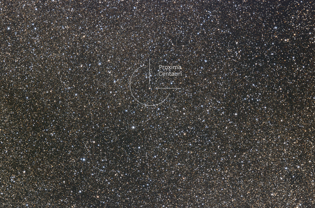| Objektbeschreibung: Proxima Centauri (lateinisch proxima, der Nächstgelegene), auch V645 Centauri oder Alpha Centauri C genannt, ist mit einer Entfernung von 4,2445 +/- 0.011 Lichtjahren der sonnennächste Fixstern. Da er mit seiner geringen scheinbaren Helligkeit der 11. Größenklasse unauffällig ist, wurde er erst im Jahr 1915 entdeckt. Die Eigenbewegung beträgt RA = 3.8"/Jahr und DE = 0.8"/Jahr. Proxima Centauri ist ein roter Zwergstern mit nur 12.5% der Sonnenmasse und einer Oberflächentemperatur von ca. 2.800 Grad. Sein Durchmesser liegt bei ungefähr 200.000 Kilometer und er hat etwa die 130-fache Jupitermasse. Die Bezeichnung V 645 weist darauf hin, dass Proxima ein Veränderlicher Stern, der Klasse von Flaresternen, ist. Die unregelmäßigen Helligkeitsschwankungen betragen um die 10 % der Grundhelligkeit. Proxima Centauri ist Zentralstern eines Planetensystems. Die Entdeckung des ersten bekannten Planeten Proxima Centauri b wurde im August 2016 bekannt gegeben und die des zweiten Proxima Centauri c im Juni 2020. Im Februar 2022 wurde die Auffindung eines dritten Planeten, Proxima Centauri d, verlautbart, der Proxima Centauri in 5,12 Tagen in einer mittleren Entfernung von 0,03 Astronomischen Einheiten umkreist. Proxima Centauri d besitzt etwa ein Viertel der Erdmasse und wurde mit dem Very Large Telescope der Europäischen Südsternwarte ESO in Chile entdeckt. Die Pressemitteilung der ESO Entdeckung finden Sie hier. Weitere Informationen und animierte Bilder der Eigenbewung von Proxima Centauri zwischen den Jahren 1998 und 2019 zeigen wir hier. |