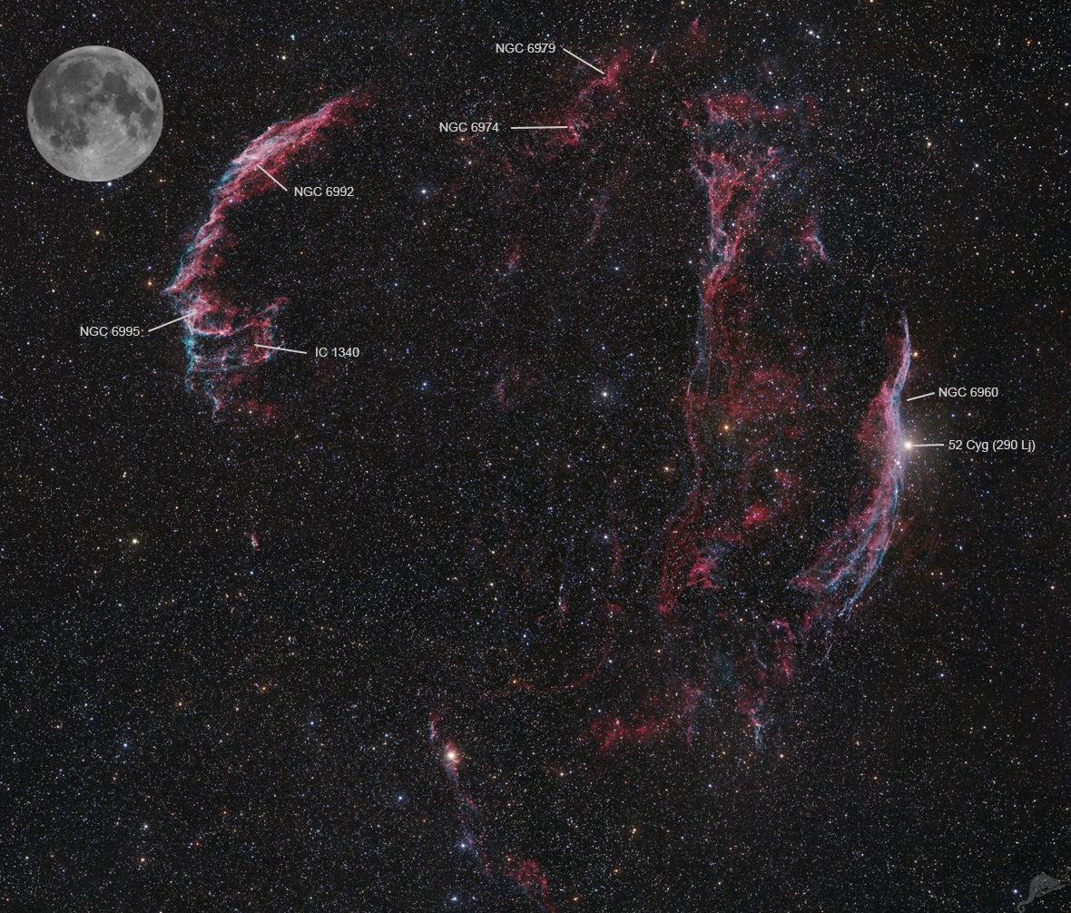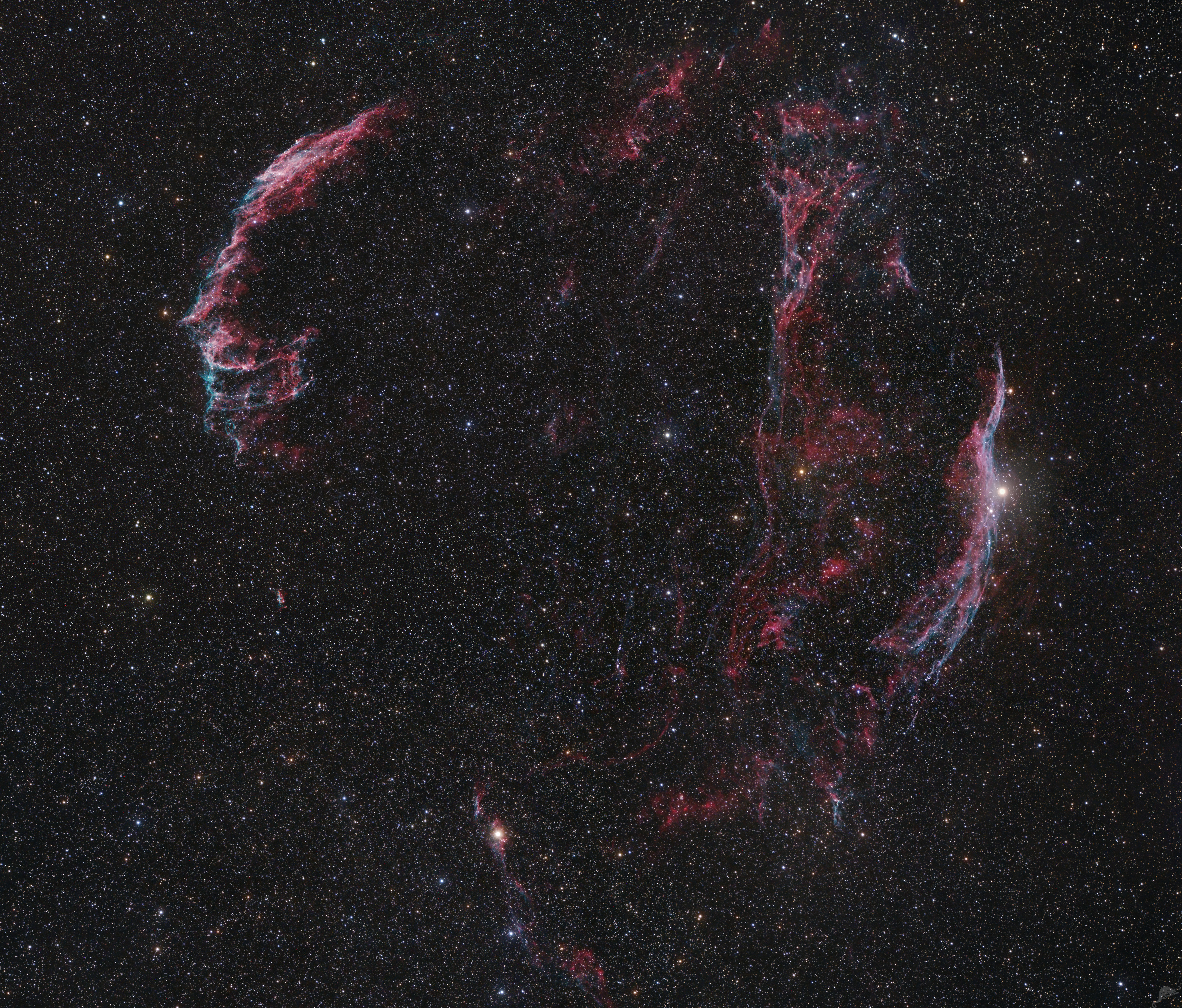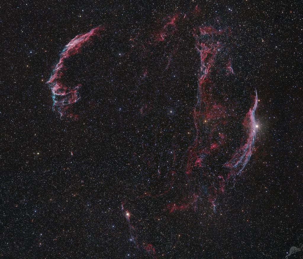The Cygnus loop - a supernova remnant in the constellation of Swan (Cygnus) - Mosaic of 6 segments Image data 2019 2022 - 6 segments all together 140 x 300 s, ZWO ASI 071 MC Pro (cooled) and Canon EOS 700 DA (cooled) Telescope: Pentax SDP 105 with reducer a f = 510mm Location: Chamäleon Observatory, Onjala Lodge, Namibia Image acquisition and processing: DeepSkyStacker, Nebulosity, Photoshop |