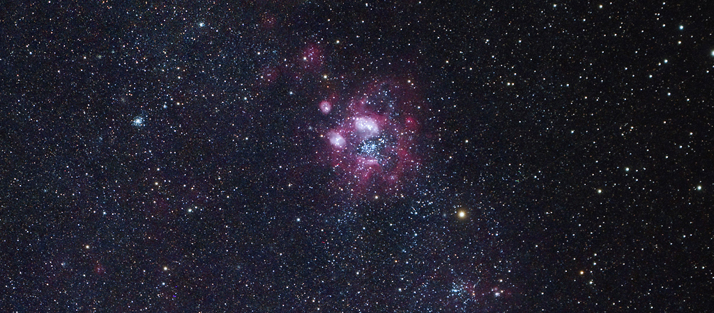 | Object description Our image shows a general view of the Large Magellanic Cloud (LMC), consisting of 8 individual segments, taken in the nights from 01 to 04 May 2022. The mosaic covers an area of about 8 x 10 degrees in the sky, in the image diagonal this corresponds to about 22,000 light years. The original size of the mosaic is 7,200 x 8,350 pixels, the image scale is about 4 arc seconds per pixel. Image orientation: north top and east left. This mosaic is undoubtedly one of our "master pieces". Taken with a Williams Optic RedCat 51 with 250mm focal length. This small but fine apochromatic refractor with a focal ratio of f/4.9 was used for the first time in 2022 (see also our mosaic of the Southern Cross together with the Coal Sack) and beats all our Canon telephoto lenses of similar focal length in optical quality by far. Together with the Small Magellanic Cloud (SMC), they are satellite galaxies of our Milky Way (Galaxy). The distance of the LMC from the solar system is just under 170,000 light years. It is the fourth largest member of the local group, only our Milky Way, the Andromeda Nebula Messier 31 and the Triangulum Galaxy Messier 33 are larger. Their names ultimately go back to the Spanish navigator Ferdinand Magellan. Until the 19th century, both galaxies were known as the Cape Clouds, a name that refers to Cape Horn, or the Cape of Good Hope, from where the galaxies were clearly visible. |