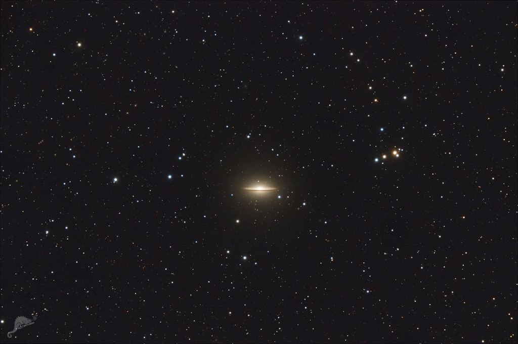 | Objektbeschreibung: Unser Bild zeigt die Galaxie Messier 104 (NGC 4594) an der Grenze zwischen den Sternbildern der Jungfrau (Virgo) und dem Raben (Corvus), die auch den Beinamen Sombrero Nebel oder Sombrero Galaxie trägt. Auffällig ist der extrem große Kernbereich (Bulge) mit einem riesigen Halo sowie dem markante Staubband, welches an einen riesigen, mexikanischen Sombrero erinnert. Nach der Hubble Klassifikation ist sie als normale Spiralgalaxie des Typs Sa oder Sb katalogisiert. Wir schauen von der Erde aus gesehen unter einem Winkel von nur 7 Grad direkt auf die Ebene (das Staubband) der Galaxie. Aufgrund der Sichtlinie sind deswegen die Spiralarme auf unserem Bild praktisch nicht sichtbar. Sie liegt in Richtung des großen Virgo Galaxienhaufens, steht aber mit einer Entfernung von etwa 30 Millionen Lichtjahren zwischen unserer Milchstraße und dem Virgohaufen. Mit einem wahren Durchmesser von 50.000 Lichtjahren ist sie etwa nur halb so groß wie unsere Milchstraße, sie beinhaltet geschätzt etwa 800 Milliarden Sonnenmassen. |