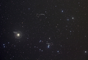 | Objektbeschreibung: Die Hyaden (Melotte 25) sind ein offener Sternhaufen im Sternbild Stier. Zusammen mit den Plejaden (Messier 45) bilden sie das so genannte "goldene" Tor der Ekliptik. Der Sternhaufen steht in einer Entfernung von nur 150 Lichtjahren zum Sonnensystem und ist dementsprechend gut erforscht. Das Alter der Sterne wird auf etwa 625 Millionen Jahre geschätzt. Er beinhaltet ungefähr 350 Sterne. Der helle Aldebaran selbst gehört allerdings nicht zu den Hyaden, sondern steht mit einer Entfernung von 67 Lichtjahren weit vor den Hyaden. Auffällig in unserem Bild sind zwei extrem rote Sterne: Es sind W Tauri und V 718 Tauri, beides sind langperiodische Veränderliche mit langen Perioden. |
