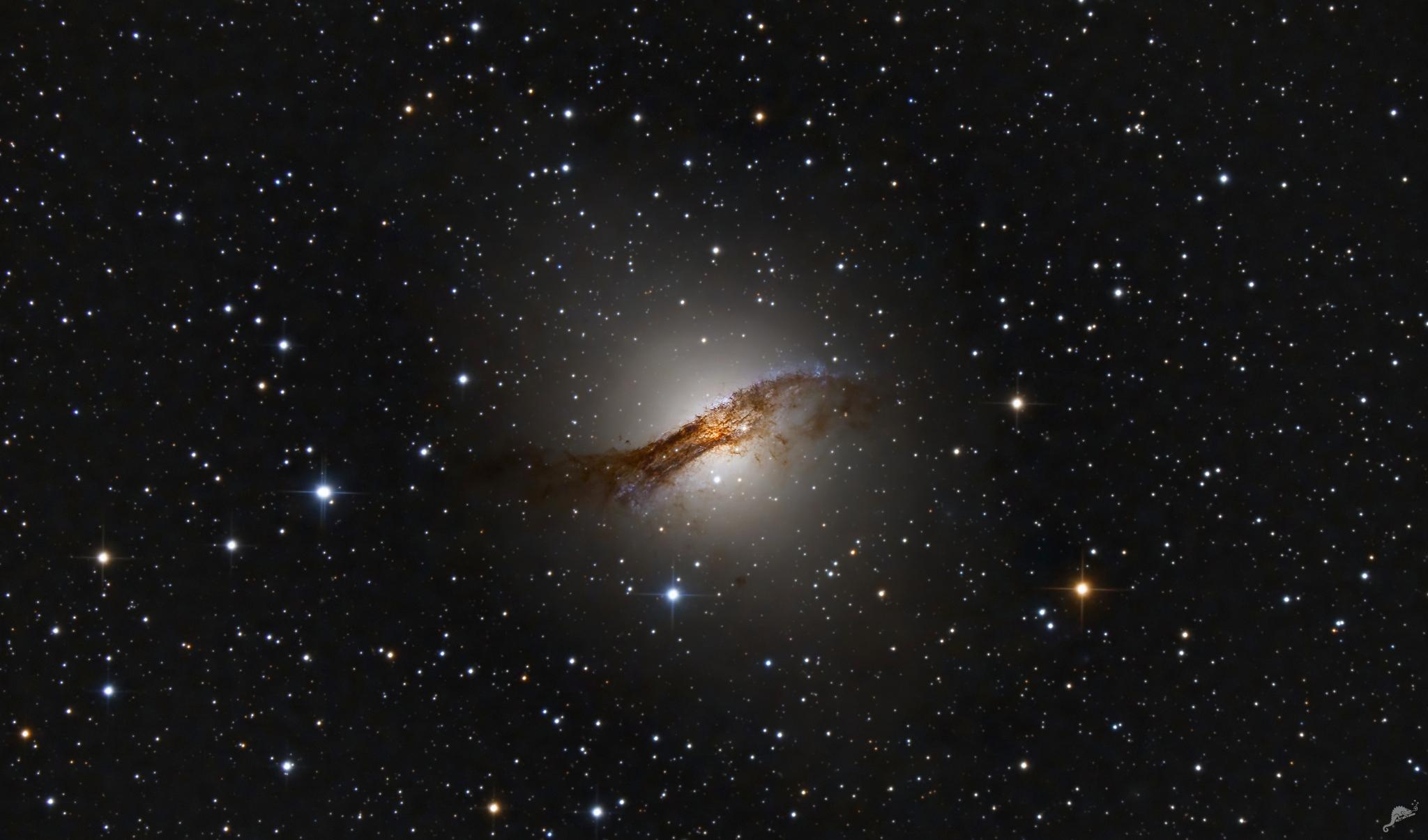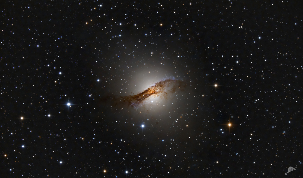 | Object description Centaurus A (NGC 5128) is one of the most extraordinary galaxies in the southern sky, both in view and in its diverse structures. At a distance of "only" 11 million light years, it is very close to the solar system and is therefore one of the best studied galaxies outside the local group. Together with Messier 83, Centaurus A forms the centre of a nearby group of galaxies outside the local group. It is the closest radio galaxy to our Milky Way and the third brightest radio source in the sky. There is still disagreement among astronomers about its morphological type, with some researchers classifying it as an elliptical type E(p) galaxy and others as a lenticular type S0 galaxy. Its characteristic optical feature is the clearly visible "bent" dust band that crosses the galaxy. In this image of NGC 5128, special focus was placed on the central area in the image processing. The outer areas are less relevant here. You can see another photo with a detailed object descriptiong by us, which show the outer areas more clearly here. |