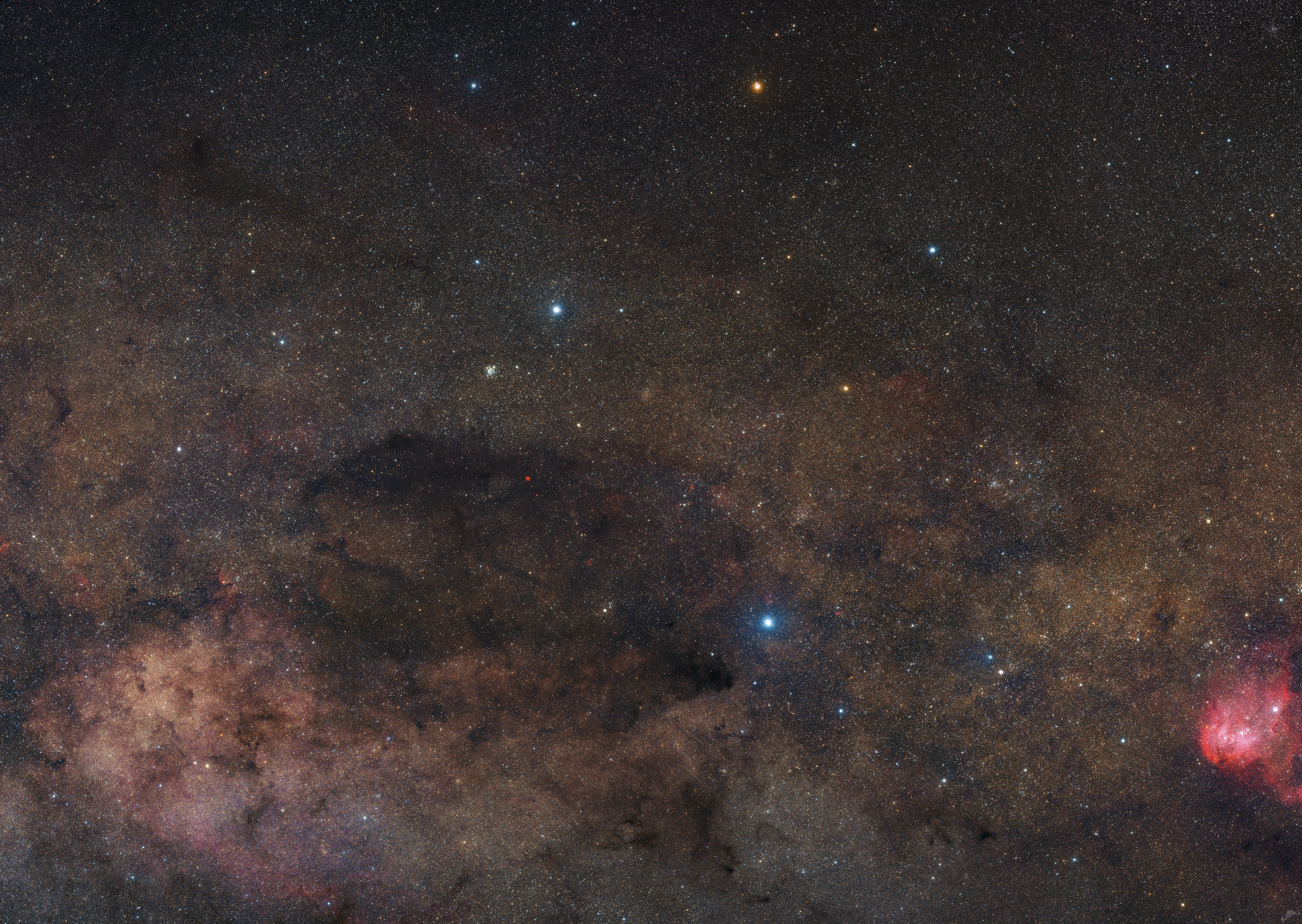 | Objektbeschreibung: Nahezu 280 Quadradgrad südliche Milchstraße. Dieses Mosaik ist zweifellos eines unserer "Master pieces". Aufgenommen mit einem Williams Optic RedCat 51 mit 250mm Brennweite. Dieser kleine, aber feine apochromatische Refraktor mit einem Öffnungsverhältnis von f/4.9 kam im Jahr 2022 zum ersten mal zum Einsatz (siehe auch unser Mosaik der großen Magellanschen Wolke) und schlägt alle unser Canon Teleobjektive ähnlicher Brennweite in der optischen Qualität um Längen. Das Originalmosaik hat eine Größe von 13.200 x 9.400 Pixel. Download 50% Originalgröße. Das Gesamtbild besteht aus insgesamt 20 einzelnen Segmenten mit einer Gesamtbelichtungszeit von etwa 20 Stunden. Das Mosaik zeigt einen Bereich nördlich und südlich des galaktischen Äquators der Sternbilder Centaurus und Kreuz des Südens zusammen mit der Dunkelwolke des "Kohlensacks, der fotografisch gar nicht so sternarm erscheint, wie mit dem bloßen Auge. Das Mosaik beginnt bei 294,5 Grad (IC 2944/48) - und endet bei etwa 308 Grad galaktische Länge. In der Höhe werden knapp 10 Grad überdeckt. Bildorientierung: Norden oben, Osten links, waagerecht = Rektasension und senkrecht = Deklination. Der galaktische Äquator liegt fast waagerecht knapp unterhalb des Sterns Acrux im Kreuz des Südens. Nähere Informationen zum Sternbild "Kreuz des Südens", deren Hauptsterne und zum "Kohlensack" geben wir hier. Object description Nearly 280 square degrees of the southern Milky Way. This mosaic is undoubtedly one of our "master pieces". Taken with a Williams Optic RedCat 51 at 250mm focal length. This small but fine apochromatic refractor with a focal ratio of f/4.9 was used for the first time in 2022 (see also our mosaic of the Large Magellanic Cloud) and beats all our Canon telephoto lenses of similar focal length in optical quality by far. The original mosaic has a size of 13,200 x 9,400 pixels. Download 50% original size. |