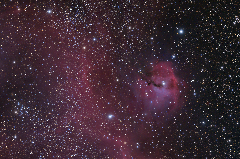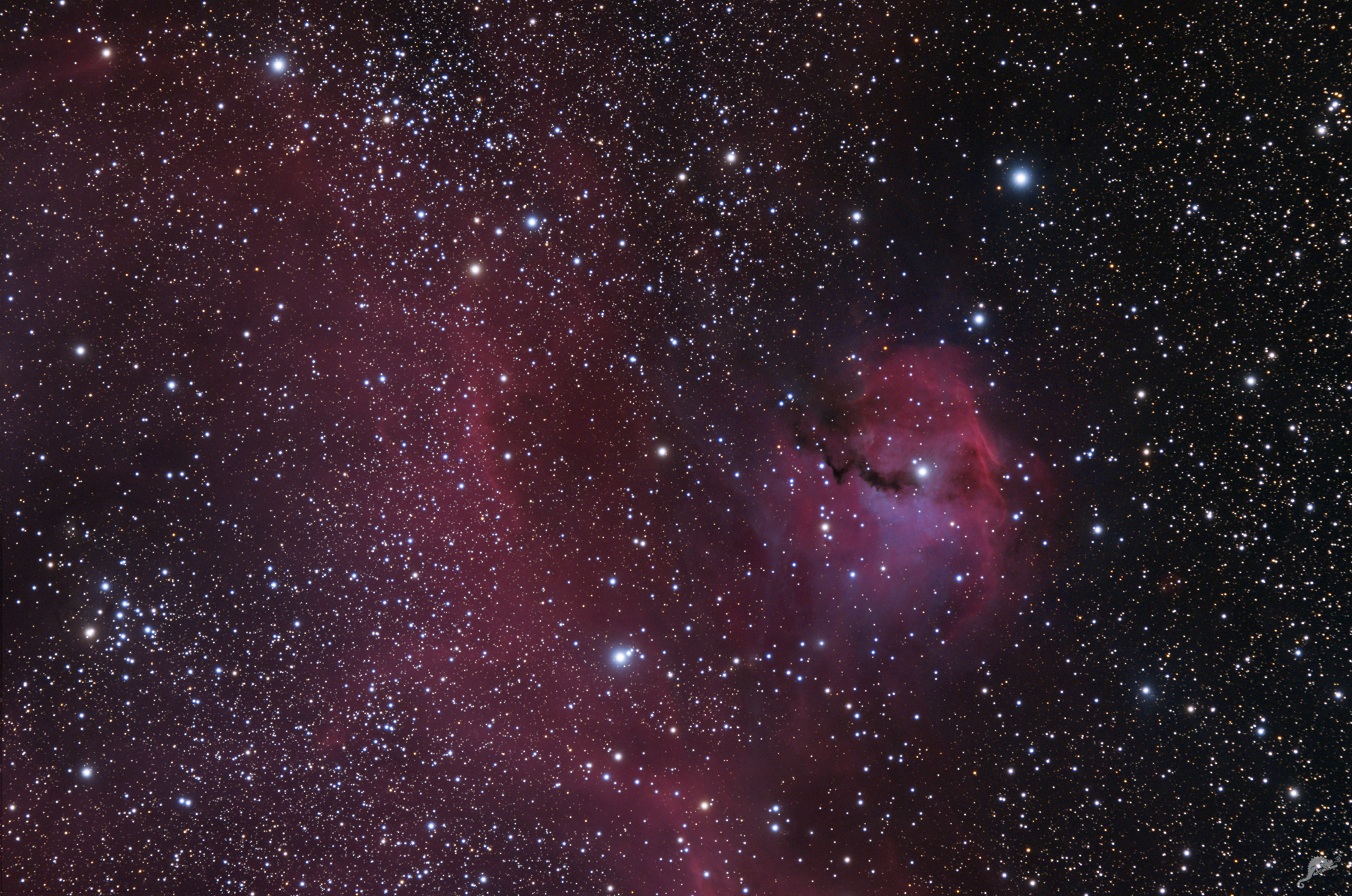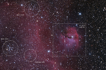 | Objektbeschreibung: IC 2177 ist das Zentrum einer großen H-II Sternentstehungsregion, vermischt mit blauen Reflexionsnebeln. Es handelt sich dabei um eine annähernd kreisförmige Struktur, ungefähr zentriert um den Be Stern HD 5336. Aufgrund seiner groben Formgebung wird er auch Möwennebel genannt. In der Bildorientierung unserer Weitwinkelansicht fliegt die Möwe in Richtung zum unteren Bildrand, wobei die annähernd runde Nebelstruktur unterhalb der Flügel dem Kopf der Möwe entspricht. Der helle "Kopf der Möwe", IC 2177, ist auch als GUM 1, Sh2-292 und vdB 93 klassifiziert und es ist eine Mischung aus Reflexions- und Emissionsnebeln. Der heiße, junge B0 Stern HD 53367 ist die Quelle für die Emissionsanregung. HD 53367 ist 20 mal so massereich wie unsere Sonne mit einem Begleiter mit 5 Sonnenmassen, der den Hauptstern auf einer stark elliptischen Umlaufbahn umkreist. Der gesamte Möwennebel ist Teil der Majoris OB1 Assoziation und steht in einer Entfernung von ca. 3750 Lichtjahren zum Sonnensystem. IC 2177 liegt entlang der Grenze zwischen den Sternbildern Monoceros und Canis Major. Weiter zeigt unser Bild die beiden hellen, offenen Sternhaufen NGC 2343 und NGC 2335. NGC 2343 ist ein offener Sternhaufen und hat einen scheinbaren Durchmesser von 6 Bogenminuten, visuell sind etwa 20 Sterne beobachtbar. Nach Trumpler wird er als Typ III 3 p n klassifiziert, die Entfernung zum Sonnensystem wird auf 3.400 Lichtjahre geschätzt. Entdeckt wurde NGC 2343 am 10. Januar 1785 von Friedrich Wilhelm Herschel. NGC 2335 ist ebenfalls ein offener Sternhaufen im Sternbild Einhorn. Nach Trumpler wird er als Typ III 3 m klassifiziert, visuell sind ca. 35 Sterne sichtbar. Die Entfernung zum Sonnensystem beträgt ungefähr 4.500 Lichtjahre. Entdeckt wurde der Sternhaufen am 10. Januar 1785 von Friedrich Wilhelm Herschel. Object description IC 7177 is the center of a large H-II star forming region, mixed with blue reflection nebulae. It is an approximately circular structure, roughly centered around the Be star HD 5336. Because of its rough shape it is also called the Seagull Nebula. In the image orientation of our wide-angle view, the seagull flies toward the bottom of the image, with the approximately circular nebular structure below the wings corresponding to the head of the seagull. The bright "head of the gull," IC 2177, is also classified as GUM 1, Sh2-292, and vdB 93, and it is a mixture of reflection and emission nebulae. The hot, young B0 star HD 53367 is the source of the emission excitation. HD 53367 is 20 times as massive as our Sun with a 5 solar mass companion orbiting the main star in a highly elliptical orbit The entire Gull Nebula is part of the Majoris OB1 association and stands at a distance of about 3750 light years from the solar system. IC 2177 lies along the boundary between the constellations Monoceros and Canis Major. |