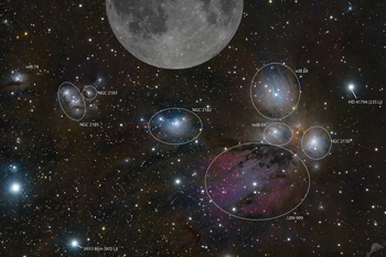 | Objektbeschreibung: NGC 2170 (vdb 69) ist ein großer Komplex aus Emissions- und Reflexionsnebeln im Sternbild Einhorn (Monoceros). Es handelt dabei um ein Teilgebiert der aktiven Sternentstehungsregion Monoceros R2, die in eine riesige Dunkelwolke aus Molekülen und Staubteilchen eingebettet ist. Die hellere Region, rechts der Bildmitte sind NGC 2167 (vdB 68) und NGC 2170, die auffälligsten Nebel in dieser Gegend. In der linken Bildhälfte heben sich die Reflexionsnebel NGC 2182, NGC 2183 und NGC 2185 vor der bräunlichen Molekülwolke ab. Die Entfernung zum Sonnensystem liegt bei etwa 2.700 Lichtjahren. Die helleren Teile (NGC 2170) wurden am 16. Oktober 1784 von William Herschel entdeckt. Einen tiefen Blick in den infraroten Spektralbereich zeigt die ESO hier. Object description NGC 2170 (vdb 69) is a large complex of emission and reflection nebulae in the constellation Unicorn (Monoceros). It is a sub-region of the active star-forming region Monoceros R2, embedded in a huge dark cloud of molecules and dust particles. The brighter region, to the right of the image center are NGC 2167 (vdB 68) and NGC 2170, the most prominent nebulae in this area. |