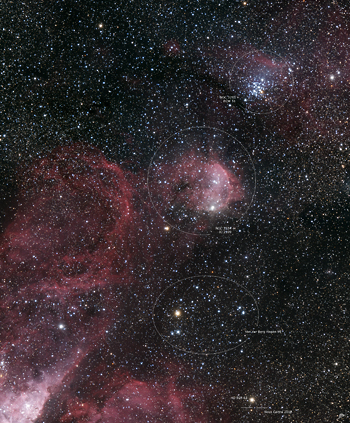 | Objektbeschreibung: NGC 3324 Unser Bild zeigt ein Mosaik aus 3 Segmenten der nordöstlichen Region des Carinanebels. Die Bildorientierung ist Norden oben und Osten links. Oben im Bild steht der offene Sternhaufen NGC 3293 mit der ihn umgebenen H-II Region RCW51 (GUM 30). Südlich von NGC 3293 steht das Sternentstehungsgebiet NGC 3324 mit dem kleinen Reflexionsnebel IC 2599. Weiter in Richtung Süden steht der helle, große offene Sternhaufen Van der Berg Hagen 99. Am unteren Bildrand steht der helle Stern HD 92063 und direkt darunter die Nova Carina 2018. Östlich davon zeigt sich der hellste Teil des großen Carina Nebels NGC 3372 mit den hellen offenen Sternhaufen Trumpler 14 und Collinder 232. |