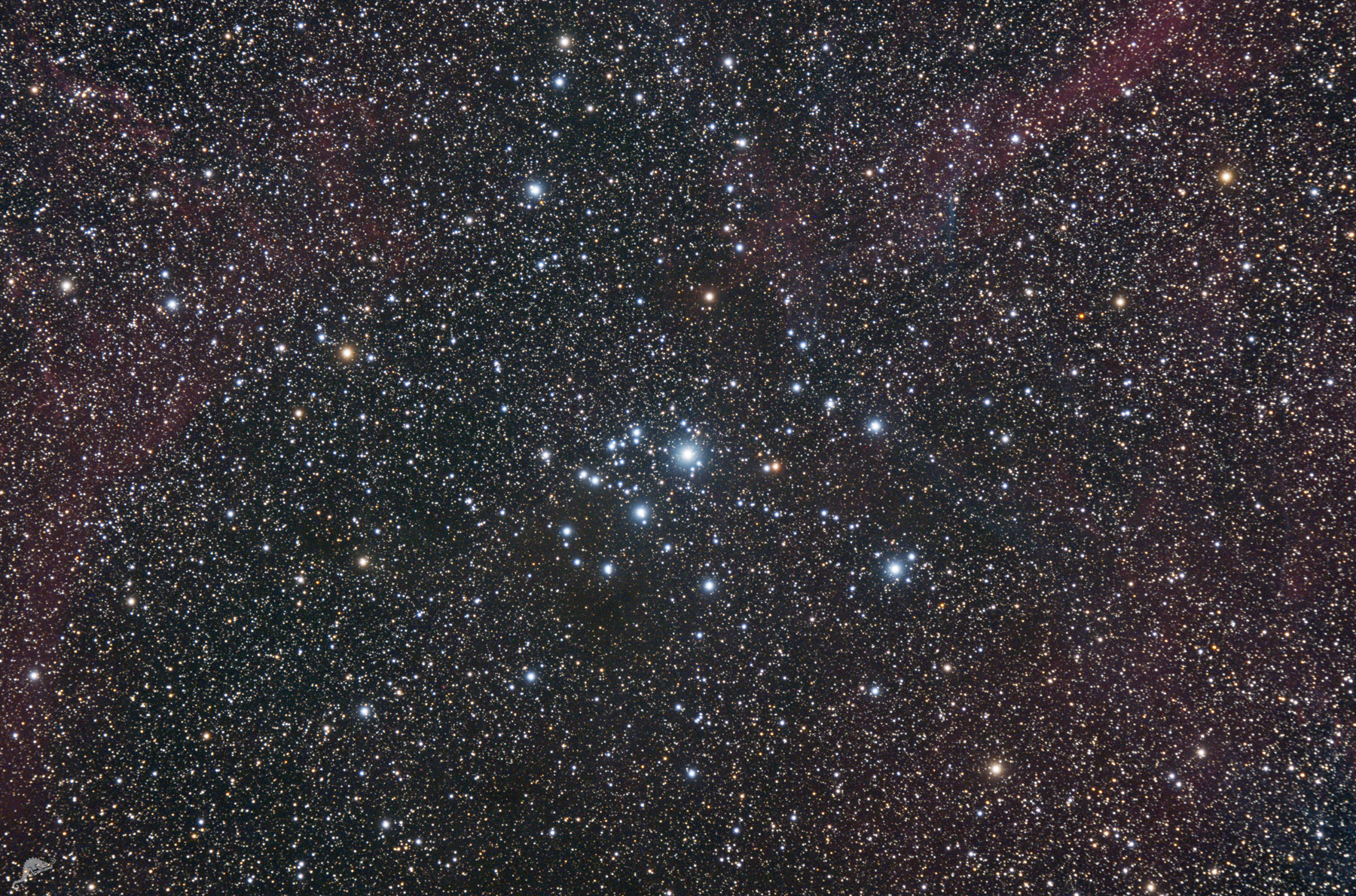 | Objektbeschreibung: IC 2395 und van den Berg Hagen 47 IC 2395 ist ein heller offener Sternhaufn im Sternbild Vela. Die helleren Sterne sind alle Hauptreihensterne vom Typ B, nach Trumpler wird er der Klasse II 3 p zugeordnet. Die Entfernung zum Sonnensystem ligt bei etwa 2.300 Lichtjahren. Die leuchtschwachen Nebelfilamente im Bild gehören zum Vela-Supernova-Überrests, dessen Ursprung eine Supernova vor etwa 12.000 Jahren war. IC 2395 wurde im Jahre 1751 von Nicolas Louis de Lacaille entdeckt. Überlagert wird IC 2395 von Van den Berg Hagen 47, einem weiteren offenen Sternhaufen zu dem es keine weiteren Information gibt. Object description IC 2395 and van den Berg Hagen 47 IC 2395 is a bright open star cluster in the constellation Vela. The brighter stars are all main sequence stars of type B, according to Trumpler it is assigned to class II 3 p. The distance to the solar system is about 2,300 lightyears. The faint nebular filaments in the image belong to the Vela supernova remnant, whose origin was a supernova about 12,000 years ago. IC 2395 was discovered in 1751 by Nicolas Louis de Lacaille. IC 2395 is overlaid by Van den Berg Hagen 47, another open star cluster for which no further information is available. . |