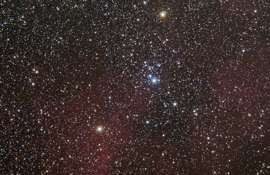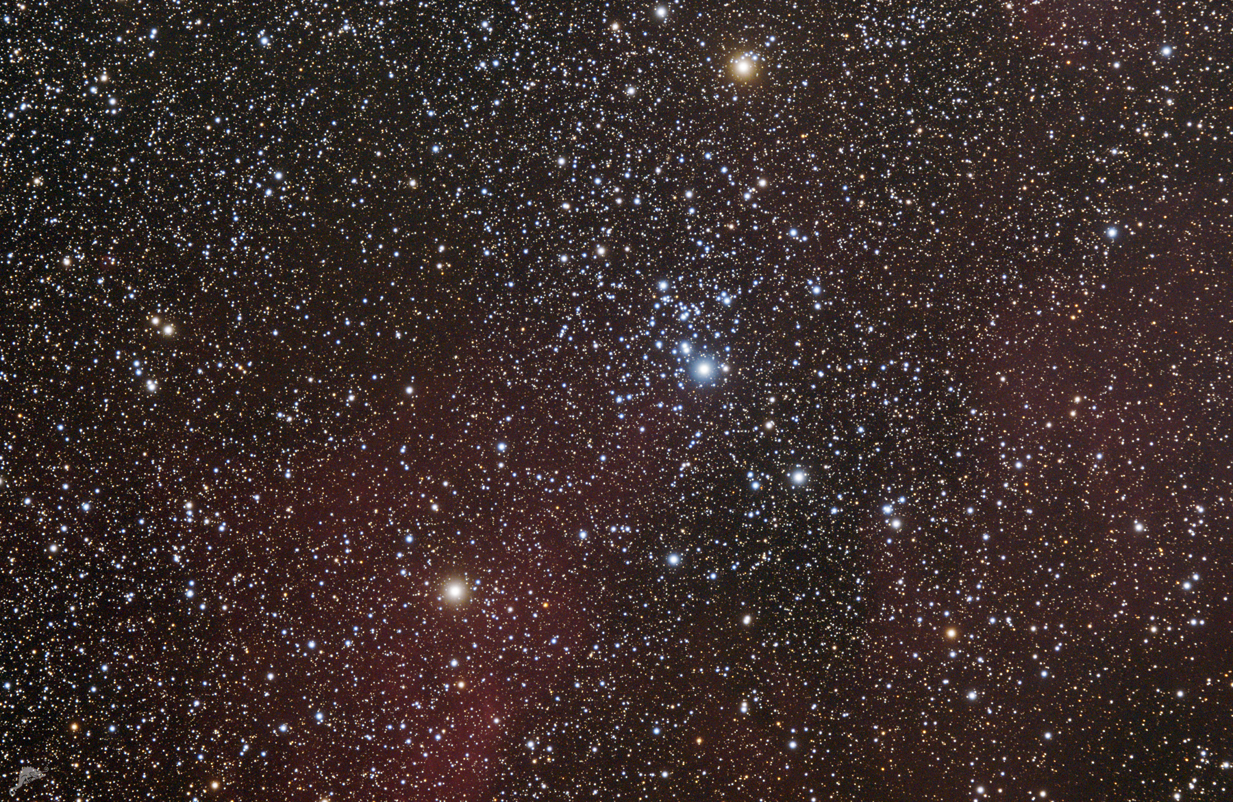 | Objektbeschreibung: NGC 2353 ist ein schöner offener Sternhaufen im Sternbild Einhorn (Monoceros). Er beinhaltet etwa 200 (visuell etwa 30) Sterne, wird nach Trumpler der Klasse II 2 p zugeordnet und ist ungefähr 3.600 Lichtjahre vom Sonnensystem entfernt. Die schwach leuchtenden H-II Regionen im Bild sind als LBN 1034 und LBN 1036 katalogisiert. NGC 2353 wurde am 10. Januar 1785 von William Herschel entdeckt. Object description NGC 2353 is a beautiful open star cluster in the constellation Unicorn (Monoceros). It contains about 200 (visually about 30) stars, is assigned to class II 2 p according to Trumpler and is about 3,600 light-years away from the solar system. The faint H-II regions in the image are cataloged as LBN 1034 and LBN 1036. NGC 2353 was discovered by William Herschel on January 10, 1785.. |