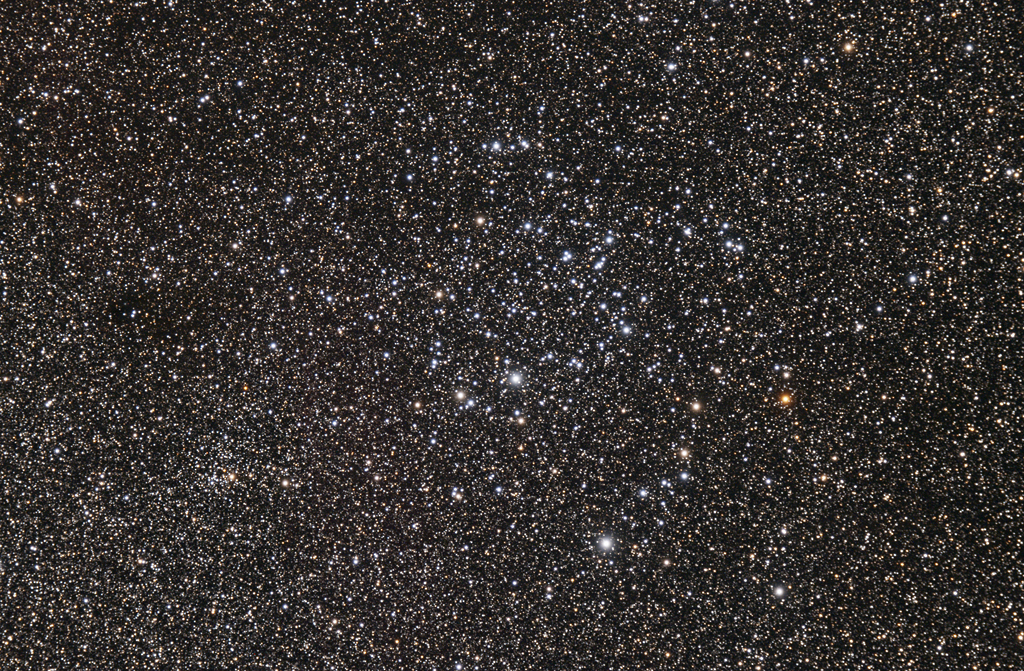 | Objektbeschreibung: NGC 3114 und Trumpler 12 sind offene Sternhaufen im Sternbild Carina (Kiel des Schiffs). NGC 3114 hebt auf Grund seines großen scheinbaren Durchmessers (Vollmond) kaum von den Hintergrundsternen ab. Er wird nach Trumpler der Klasse II 3 r zugeordnet, seine Entfernung zum Sonnensystem beträgt ungefähr 3.000 Lichtjahre. Südöstlich (links unten) steht der kompakte Sternhaufen Trumpler 12. Entdeckt wurde NGC 3114 am 8. Mai 1826 von James Dunlop. Object description NGC 3114 and Trumpler 12 are open star clusters in the constellation Carina (keel of the ship). NGC 3114 hardly stands out from the background stars due to its large apparent diameter (full moon). It is assigned to class II 3 r according to Trumpler, its distance to the solar system is about 3,000 light-years. Southeast is the compact star cluster Trumpler 12. NGC 3114 was discovered by James Dunlop on May 8, 1826. |