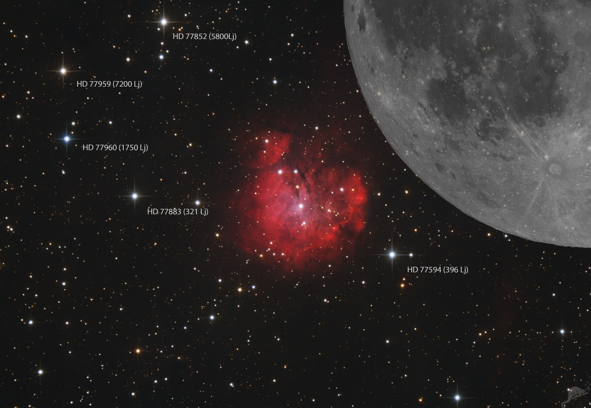 | Objektbeschreibung: GN 09.00.7 - Unser Bild zeigt die relativ helle Sternentstehungsregion GN 09.00.7, auch als RCW 40 und GUM 25 katalogisiert im Sternbild Vela. Sie scheint ein Teil der Vela OB1-Assoziation zu sein und ist etwa 6.000 Lichtjahre vom Sonnensystem entfernt. Hauptquelle für die Ionisation des Wasserstoffgases ist ein Mehrfachstern im Zentrum von etwa 12. Größenklasse mit dem Spektraltyp O9V, der als CD -48 4352 katalogisiert ist. |