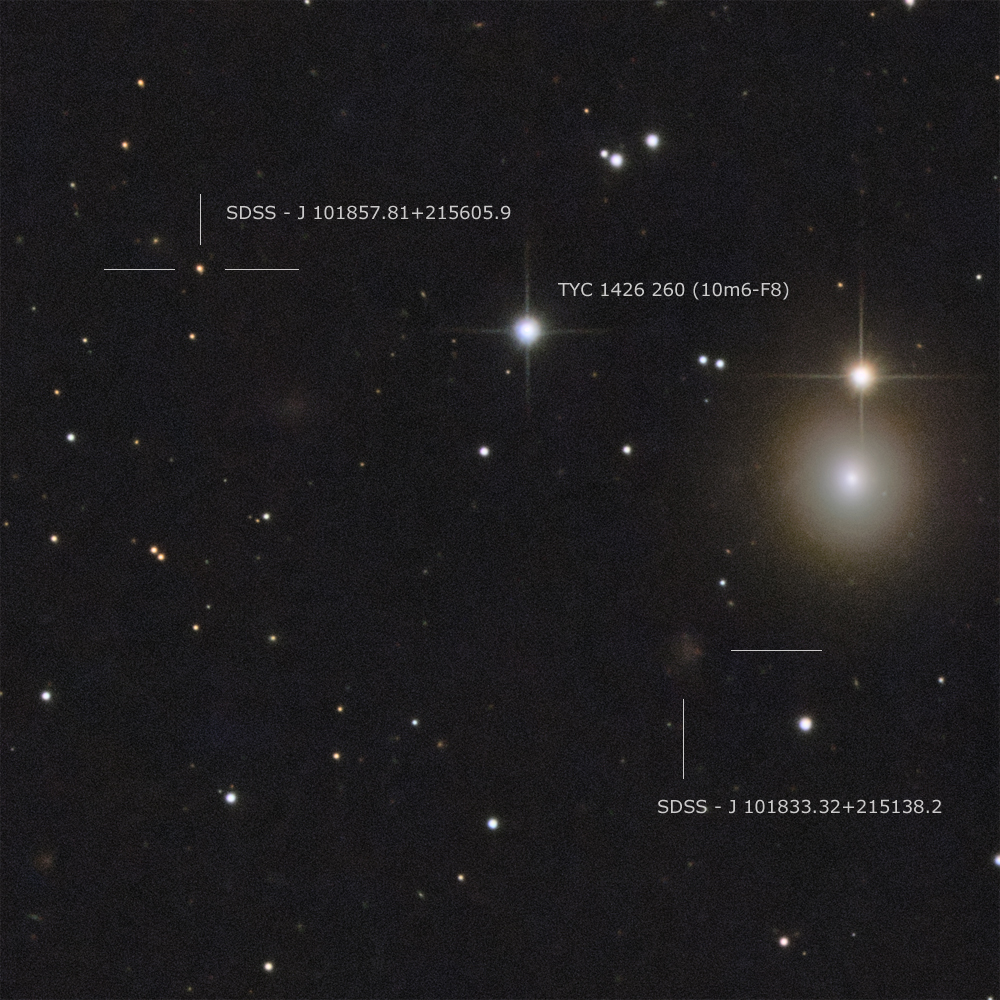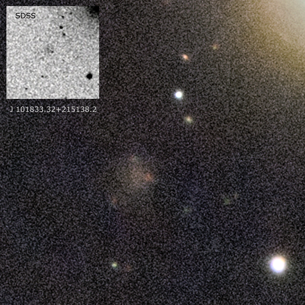 J 101857.81+215605.9 (SDSS = Sloan Digital Sky Survey ) SDSS - J 101833.32+215138.2 bei den Koordinaten 10h 18m 32.7s und +21 51 36.4 ist eine kleine kompakte Galaxiengruppe der visuellen Helligkeit von 17m8 mit einer Rotverschiebung von z = 0.48 was einer Entfernung von etwa 5 Milliarden Lichtjahren entspricht. SDSS - J 101857.81+215605.9 bei den Koordinaten 10h 18m 57.81 und +21 56 06.0 ist noch wesentlich weiter entfernt. Es ist vermutlich ein Quasar (der aktive Kern einer Galaxie, der im sichtbaren Bereich des Lichts nahezu punktförmig erscheint) mit der visuellen Helligkeit 18m0 mit einer Rotverschiebung von z = 4.7. Das entspricht grob einer Entfernung von knapp 13 Milliarden Lichtjahren. Die recherchierten Daten dazu stammen aus der Datenbank des NASA/IPAC Extragalactic Database. |