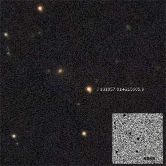 SDSS - J 101857.81+215605.9 (SDSS = Sloan Digital Sky Survey) SDSS - J 101833.32+215138.2 at coordinates 10h 18m 32.7s and +21 51 36.4 is a small compact galaxy group of visual magnitude 17m8 with a redshift of z = 0.48 which corresponds to a distance of about 5 billion light years. SDSS - J 101833.32+215138.2SDSS - J 101857.81+215605.9 at coordinates 10h 18m 57.81 and +21 56 06.0 is much further away. It is probably a quasar (the active nucleus of a galaxy that appears almost point-like in the visible range of light) with a visual magnitude of 18m0 and a redshift of z = 4.7. This roughly corresponds to a distance of almost 13 billion light years. The researched data comes from the NASA/IPAC Extragalactic Database |