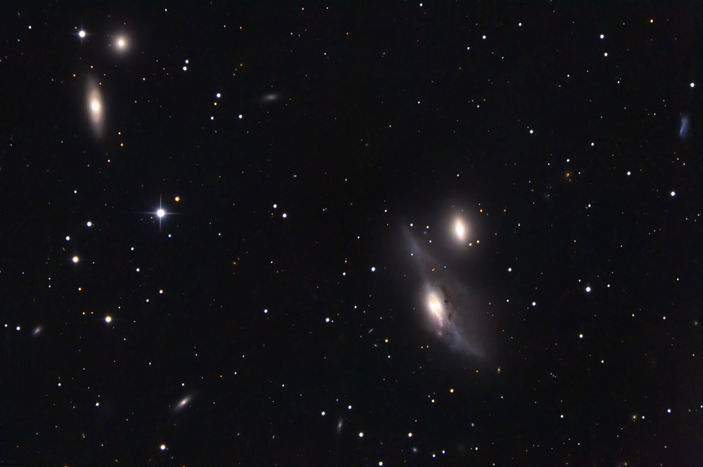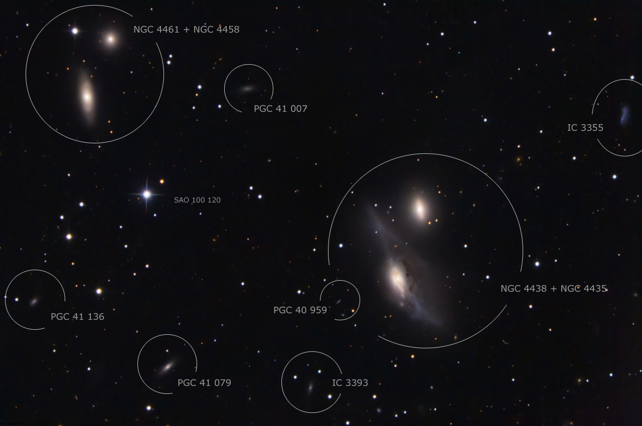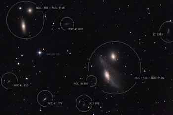Objektbeschreibung: NGC 4438 + NGC 4435 - Unser Bild zeigt ein weiteres Beispiel für wechselwirkende Galaxien (interacting galaxies). Es sind NGC 4435 und NGC 4438 im Jungfrau. Beide sind Mitglieder des Virgo Galaxienhaufens (LGG 292). Beide Galaxien sind etwa 55 Millionen Lichtjahre vom Sonnensystem entfernt und wurden am 8. April 1784 von Friedrich Wilhelm Herschel entdeckt. Den kompletten Katalog von wechselwirkenden Galaxiengruppen von Halton Arp finden Sie online hier. NGC 4435 ist eine so genannte linsenförmige Balkengalaxie, die aktuell mit NGC 4438 wechselwirkt. Untersuchungen mit dem Spitzer-Weltraumteleskop zeigen eine relativ junge, nur knapp 200 Millionen Jahre alte, Sternpopulation im Galaxienkern, die möglicherweise durch die Wechselwirkung mit NGC 4438 entstanden ist, bei der Gas und Staub in dieser Region komprimiert wurden, was eine hohe Sternentstehungsrate ausgelöst hat. NGC 4438 ist die auffälligste wechselwirkende Galaxie im Virgo-Haufen. Diese Galaxie weist eine stark verzerrte Scheibe auf, einschließlich langer Gezeitenschweife aufgrund der Gravitationswechselwirkungen mit NGC 4435 anderen Galaxien im Haufen. Die starke Verformung von NGC 4438 geht nach Beobachtungen aus dem Jahr 2008 auf eine enge Begegnung mit Messier 86 (in unserem Bild gerade rechts außerhalb liegend) vor rund 100 Millionen Jahren zurück. Weiterhin zeigt unser Bild weitere Galaxien des Virgo Haufens. Die lichtschwächste ist PGC 40 959 mit knapp 20ster Größenklasse. Interessant ist auch IC 3355 am rechten oberen Bildrand. Auffällig ist die blaue Farbe, die auf hohe Sternentstehungsrate hinweist. Sie hat etwa nur eine Durchmesser von 2.000 Lichtjahre und mit einer Entfernung von ungefär 16 Millionen Lichtjahre ist ihre Zugehörigkeit zum Virgo Haufen zweifelhaft. Mit der Nummer VCC 945 ist sie trotzdem als Mitglied des Virgo-Galaxienhaufens katalogisiert. Sie wurde erst am 17. November 1900 vom deutschen Astronomen Arnold Schwassmann entdeckt. Object description NGC 4438 + NGC 4435 - Our image shows another example of interacting galaxies. They are NGC 4435 and NGC 4438 in Virgo. Both are members of the Virgo galaxy cluster (LGG 292). Both galaxies are about 55 million light years away from the solar system and were discovered by Friedrich Wilhelm Herschel on April 8, 1784. The complete catalog of interacting galaxy groups by Halton Arp can be found online here. NGC 4435 is a so-called lenticular barred galaxy that is currently interacting with NGC 4438. Investigations with the Spitzer Space Telescope show a relatively young, barely 200 million year old, stellar population in the galaxy core, which may have been formed by the interaction with NGC 4438, in which gas and dust were compressed in this region, triggering a high star formation rate. NGC 4438 is the most conspicuous interacting galaxy in the Virgo Cluster. This galaxy exhibits a highly distorted disk, including long tidal tails due to gravitational interactions with NGC 4435 other galaxies in the cluster. According to observations made in 2008, the strong distortion of NGC 4438 is due to a close encounter with Messier 86 (just outside to the right in our image) around 100 million years ago. |