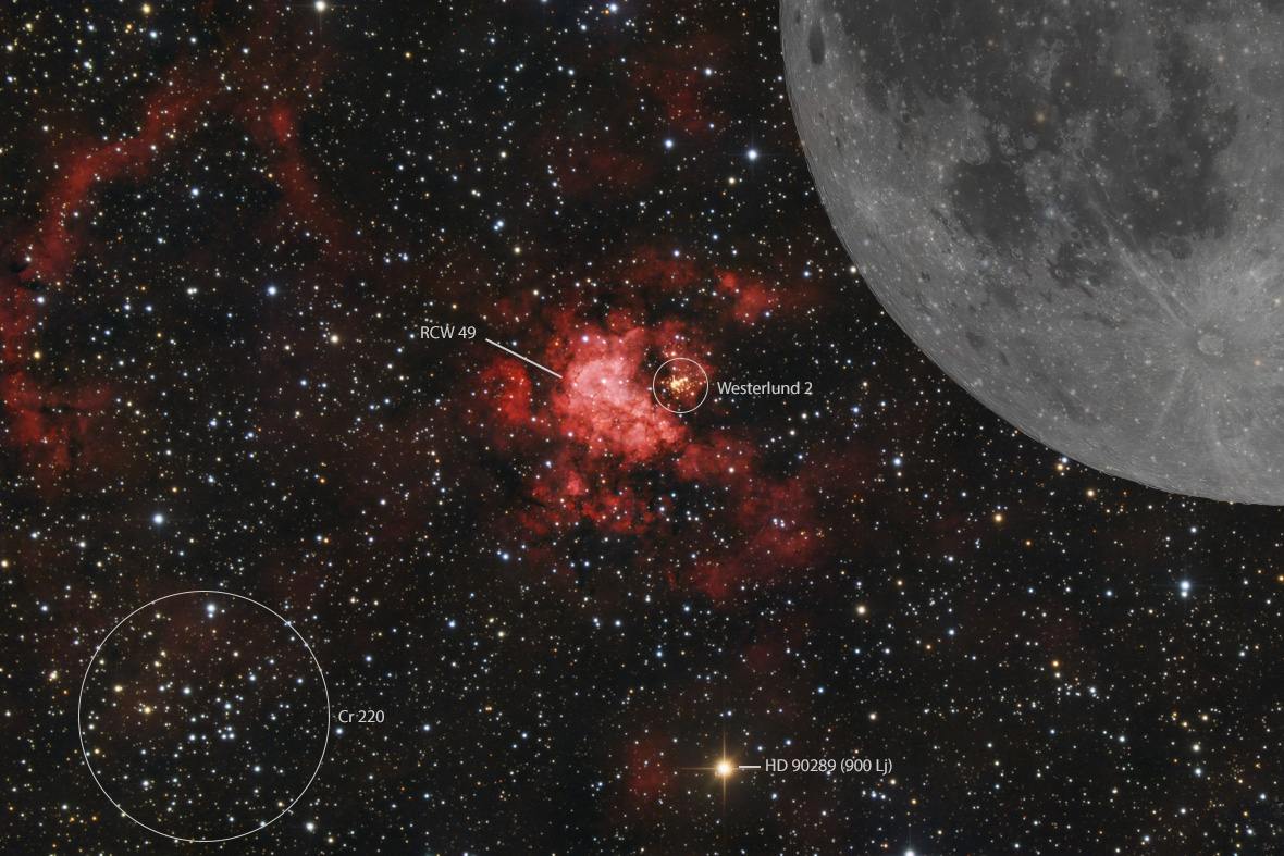 | Emissionsnebel RCW 49 mit Westerlund 2 im Sternbild Kiel des