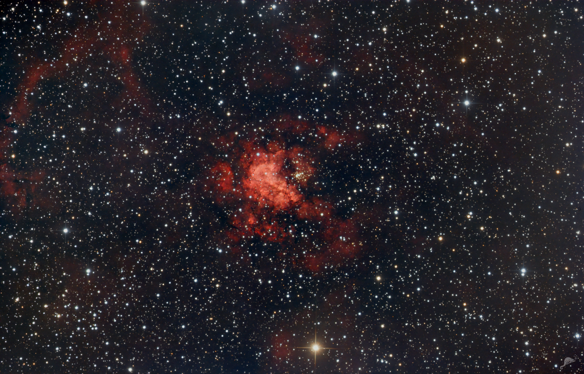| Emission nebula RCW 49 with Westerlund 2 in the constellation Carina Image data 08.-10.06.2023 - 18 x 600 s, QHY ALccd 12 (cooled) Telescope: PlaneWave CDK 12.5" Astrograph + 0.8x Reducer at f = 2030 mmm Location: Chamäleon Observatory, Onjala Lodge, Namibia Image acquisition and processing: DeepSkyStacker, PixInsight + Photoshop |