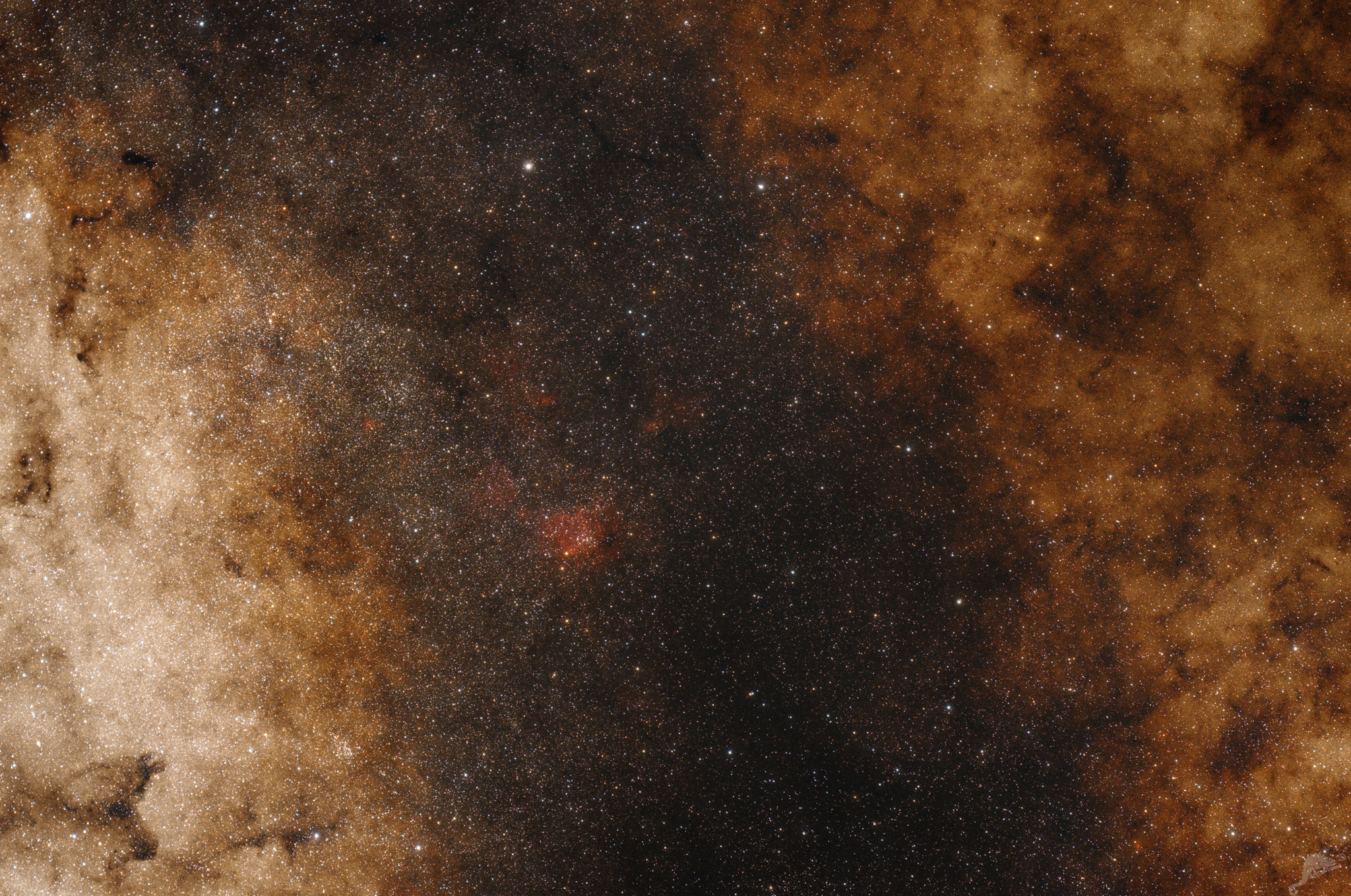 | Objektbeschreibung: Das Zentrum unserer Milchstarße - Unser Bild zeigt eine Weitwinkelansicht auf das Zentrum unserer Milchstraße im Sternbild Schütze bei den galaktischen Koordinaten 0 Grad Länge und 0 Grad Breite. Es ist rund 26.700 Lichtjahre vom Sonnensystem entfernt und im sichtbaren Licht hinter gigantischen Gas und Staubwolken verborgen. Sie absorbieren das Licht der dahinter- und darin liegenden Sterne nahezu vollständig. Erst mit längeren Wellenlängen im Infraroten Bereich kann der Staub durchdrungen werden und das helle Zentrum wird "sichtbar". Dort liegt das supermassereiche Schwarze Loch Sagittarius A* mit einer Masse von 4,1 Millionen Sonnenmassen. In unserem Bild liegt das galaktische Zentrum exakt zwischen den Emissionsnebeln Sh2-16 und Sh2-17, die im beschrifteten Bild (unten) gekennzeichnet sind. Object description The center of our Milky Way - Our image shows a wide-angle view of the center of our Milky Way in the constellation Sagittarius at galactic coordinates 0 degrees longitude and 0 degrees latitude. It is about 26,700 light years away from the solar system and hidden in visible light behind gigantic gas and dust clouds. |