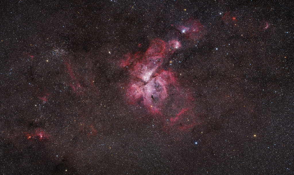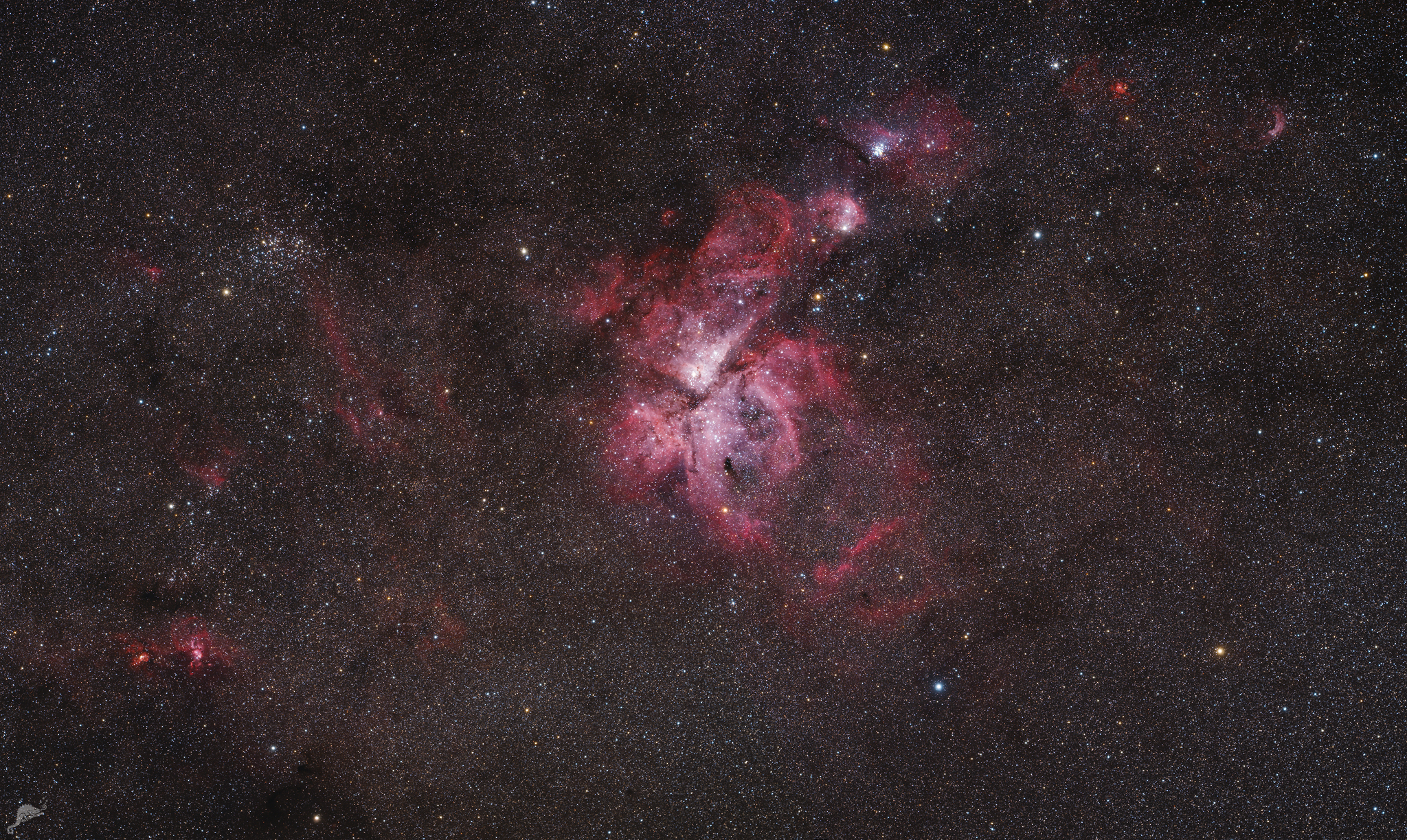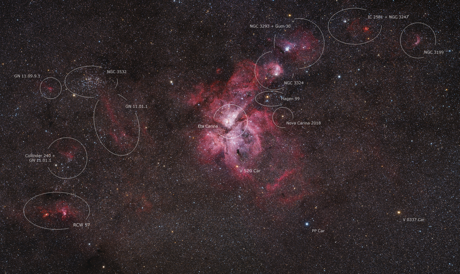| Objektbeschreibung: Die Umgebung von NGC 3372, dem großen Carinanebel - Das Bild zeigt ein Mosaik, bestehend aus 4 Segmenten, zentriert auf NGC 3372, aufgenommen mit dem Williams ReCat mit einer Brennweite von 250 mm und einer Gesamtbelichtungszeit von 6 Stunden. Die Region ist sicher seit der Erfindung der Fotografie das meist abgebildete Objekt der südlichen Milchstraße. Auch wir haben es in den letzten 10 Jahren - zwischen 2013 und 2023 - mit unterschiedlichen Brennweiten und unter verschiedenen Wetterbedingungen fotografiert. Auch die Einzelobjekte, die auf dieser Weitwinkelansicht zu sehen sind, haben wir auch mit längeren Brennweiten dokumentiert. Es sind von von Südost (links unten) nach Nordwest folgende Einzelobjekte: RCW 57 (NGC 3603 + NGC 3579), Collinder 240, NGC 3532, Eta Carina, Nova Carina, Hagen 99, NGC 3324, NGC 3293, IC 2581, NGC 3247 und NGC 3199. Object description The surroundings of NGC 3372, the Great Carina Nebula - Our image shows a mosaic consisting of 4 segments centered on NGC 3372. Taken with the Williams ReCat with a focal length of 250 mm and a total exposure time of 6 hours. The region is certainly the most imaged object of the southern sky since the invention of photography. |