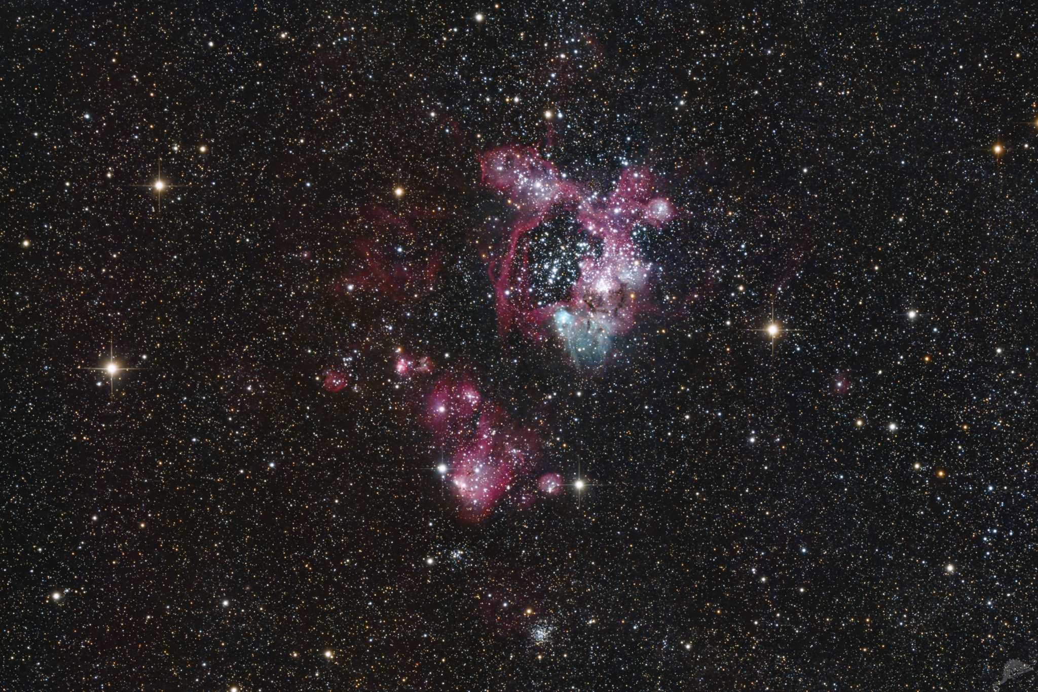 | NGC 1935, NGC 1936 and IC 2128 - H-II emission and open star clusters in the Large Magellanic Cloud Image data 18.05.2023 - 15 x 300 s, QHY ALccd 12 (cooled) Telescope: PlaneWave CDK 12.5" Astrograph + 0.8x Reducer at f = 2030 mmm Location: Chamäleon Observatory, Onjala Lodge, Namibia Image acquisition and processing: DeepSkyStacker, PixInsight + Photoshop Coordinates; RA: 05 22 00 - DEC: -67 56 30 |