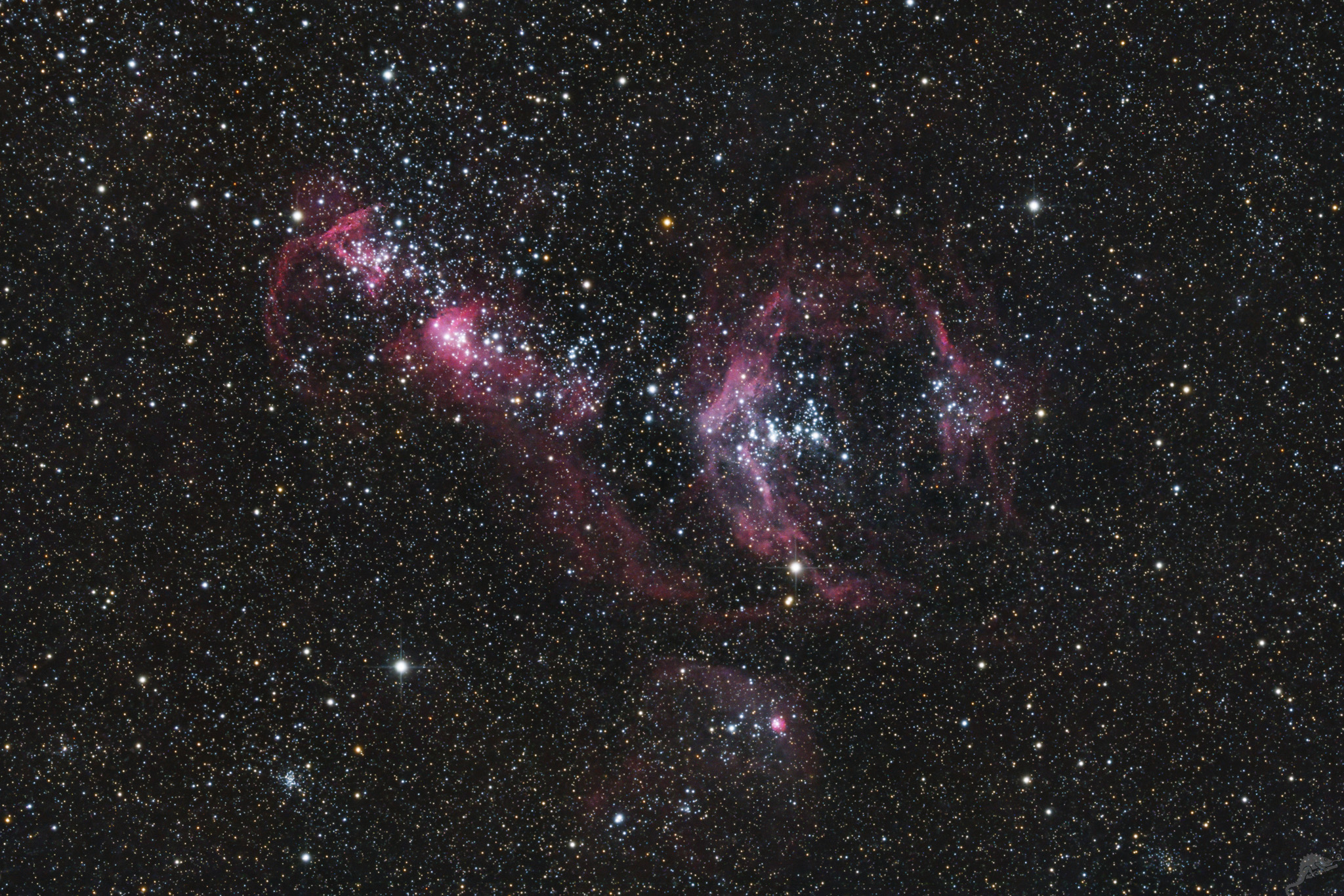 | Objektbeschreibung: Henize 51 - N 51 ist ein gewaltiger H-II Sternentstehungskomplex in der großen Magellanschen Wolke (LMC). In diese eingebettet liegen die jungen offenen Sternhaufen NGC 1974, NGC 1968 und NGC 1955 (im Bild von links nach rechts). Die Bezeichnung N 51 stammt aus Einträgen eines Katalogs des amerikanischen Astronomen und Astronauten Karl Gordon Henize aus dem Jahr 1956. Die Strahlung der jungen, blauen und sehr heißen Sterne in den offenen Sternhaufen löst Elektronen aus den Atomen des umgebenden Wasserstoffgases, ionisiert es und erzeugt das charakteristisches rotes Leuchten. Zusätzlich zu dieser starken Strahlung erzeugen die massereichen Sterne auch kräftige Sternwinde, die schließlich dazu führen, dass sich das Gas um sie herum auflöst. Wie auch in der Milchstraße findet in der Große Magellansche Wolke aktive Sternentstehung statt. Einige dieser Regionen sind bereits mit dem bloßen Auge sichtbar, zum Beispiel der berühmte Tarantelnebel (NGC 2070). Es gibt jedoch auch andere, kleinere - aber nicht weniger faszinierende - Regionen, die auch mit kleinen Amateurteleskopen bis ins Detail sichtbar gemacht werden können. Weitere Beispiele zeigen wir hier und hier. Und die Region des Tarantelnebels hier. Object description Henize 51 - N 51 is a gigantic H-II star-forming complex in the Large Magellanic Cloud (LMC). Embedded in it are the young open star clusters NGC 1974, NGC 1968 and NGC 1955 (from left to right in the image). The designation N 51 comes from entries in a catalog compiled by the American astronomer and astronaut Karl Gordon Henize in 1956. The radiation from the young, blue and very hot stars in the open star clusters releases electrons from the atoms of the surrounding hydrogen gas, ionizes it and produces the characteristic red glow. In addition to this strong radiation, the massive stars also generate powerful stellar winds, which eventually cause the gas around them to disintegrate. |