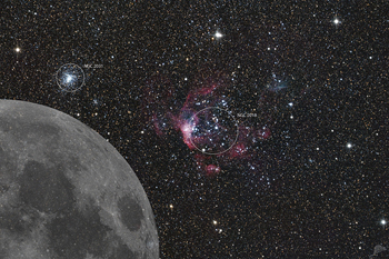 | Objektbeschreibung: NGC 2018 - Auch im südlichen Teil der Großen Magellanschen Wolke gibt es große Sternentstehungsgebiete mit massereichen Sternhaufen, die über gewaltige Entfernungen die Gase zum Leuchten anregen. NGC 2018 ist der hellste Teil einer großen Region mit hellen Sternen, offenen Sternhaufen und Nebeln. Die Region im Bild erstreckt sich über einen wahren Durchmesser von einigen hundert Lichtjahren. Der H-II Nebelkomplex ist als N 206 A katalogisiert und könnte laut des Anglo-American Observatory ein Supernovaüberrest sein. Links oberhalb der Bildmitte befindet sich NGC 2031, ein unsymmetrischer Kugelsternhaufen unserer Begleitgalaxie. Der Sternhaufen wurde am 3. November 1834 von dem Astronomen John Herschel entdeckt. Ein hoch aufgelöstes Mosaik der kompletten großen Magellanschen Wolke zeigen wir hier. Object description |