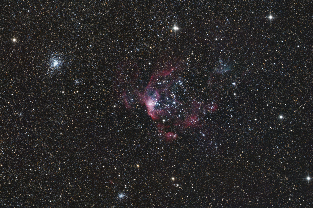 | NGC 2018 - an open star cluster with emission nebula in the Large Magellanic Cloud Image data 19.05.2023 - 12 x 300 s, QHY ALccd 12 (cooled) Telescope: PlaneWave CDK 12.5" Astrograph + 0.8x Reducer at f = 2030 mmm Location: Chamäleon Observatory, Onjala Lodge, Namibia Image acquisition and processing: DeepSkyStacker, PixInsight + Photoshop Coordinates: RA: 05 31 30 - DEC: -71 04 00 |