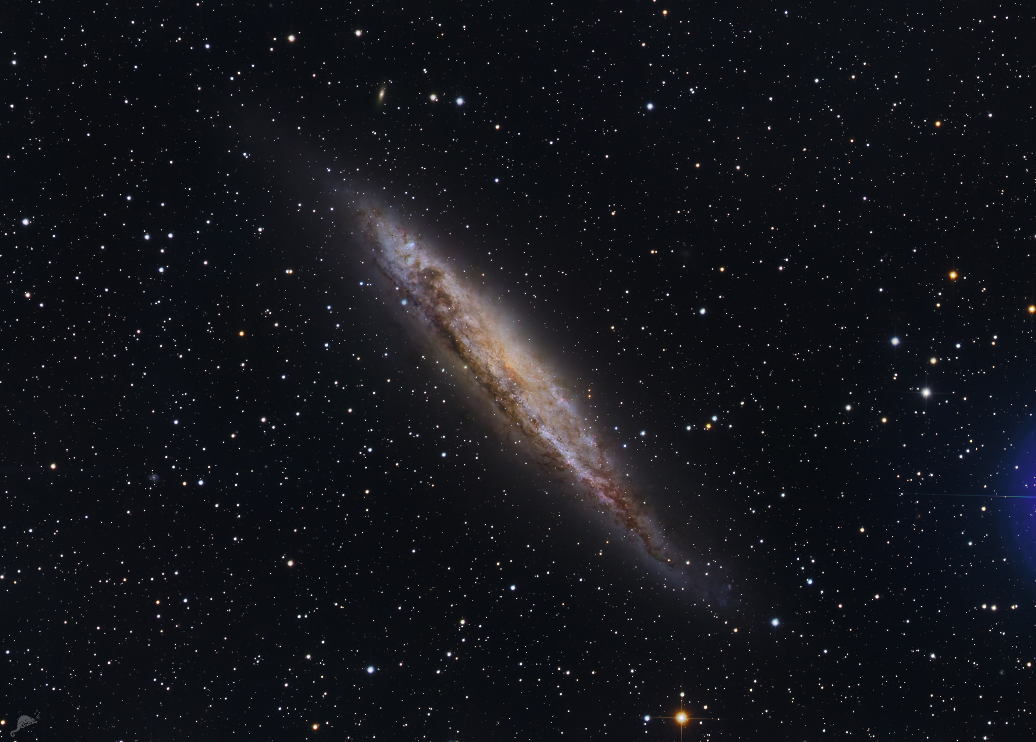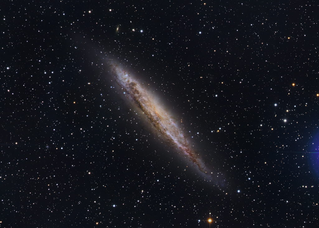 | Objektbeschreibung: NGC 4945 - Unser hoch aufgelöstes Bild zeigt die Spiralgalaxie NGC 4945. Wir sehen Sie annähernd in einer Kantenansicht und so etwa würden wir auch unsere Milchstraße von außerhalb betrachten können. Sie ist allerdings mit einem Durchmesser von knapp 150.000 Lichtjahre deutlich größer als die Milchstraße, ihre Entfernung zum Sonnensystem beträgt etwa 17 Millionen Lichtjahre. Die staubige Scheibe zeigt rosarote Sternentstehungsregionen und eine Vielzahl von jungen blauen offenen Sternhaufen. Die Zentralregion der Galaxie liegt für unser optisches Teleskop von Staubwolken verborgen. Professionelle Beobachtungen im Röntgen- und infraroten Spektralbereich zeigen aber deutliche Hinweise auf Sternentstehung und im Zentrum befindet sich ein aktives, massereiches schwarzes Loch, deshalb ist NGC 4945 als Seyfertgalaxie katalogisiert. Nördlich (im Bild oben) von NGC 4945 liegt die Galaxie PGC 45 317, die aber mit einer Entfernung von etwa 400 Millionen Lichtjahre deutlich weiter entfernt ist. Das Objekt wurde am 29. April 1826 vom schottischen Astronomen James Dunlop entdeckt. Das blaue Streulicht am rechten Bildrand stammt von dem sehr hellen Stern xi 1 Zentaurus. Object description NGC 4945 - Our high-resolution image shows the spiral galaxy NGC 4945. We see it approximately in an edge-on view, which is roughly how we would also be able to view our Milky Way from outside. However, with a diameter of almost 150,000 light years, it is significantly larger than the Milky Way, and its distance from the solar system is around 17 million light years. The dusty disk shows pink star-forming regions and a large number of young blue open star clusters. The central region of the galaxy is hidden from our optical telescope by clouds of dust. However, professional observations in the X-ray and infrared spectral range show clear evidence of star formation and there is an active, massive black hole in the center, which is why NGC 4945 is cataloged as a Seyfert galaxy. To the north (in the image above) of NGC 4945 lies the galaxy PGC 45 317, which is significantly further away at a distance of around 400 million light years. The object was discovered on April 29, 1826 by Scottish astronomer James Dunlop. The blue scattered light at the right edge of the image is caused by the very bright star xi 1 Centaurus. |
