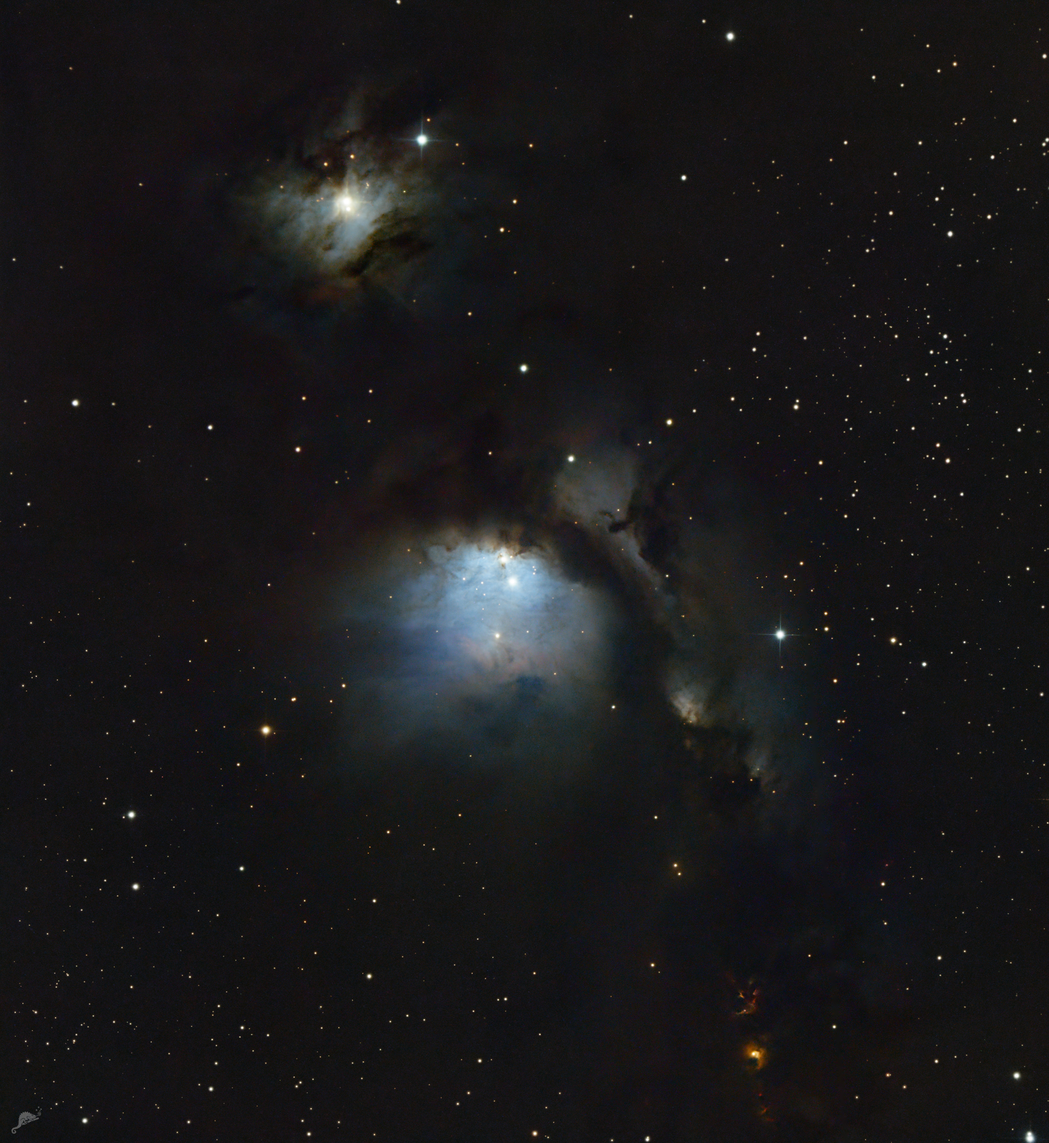 | Messier 78 78, NGC 2071, 20664, 2067, LDN 1672 and the Herbig Haro objects HH 24, 25 and 26 Image data 09-14.04.2023 - total 30 x 600 s, QHY ALccd 12 (cooled) Telescope: PlaneWave CDK 12.5" Astrograph + 0.8x Reducer at f = 2030 mmm Location: Chamäleon Observatory, Onjala Lodge, Namibia Image acquisition and processing: DeepSkyStacker, PixInsight + Photoshop |